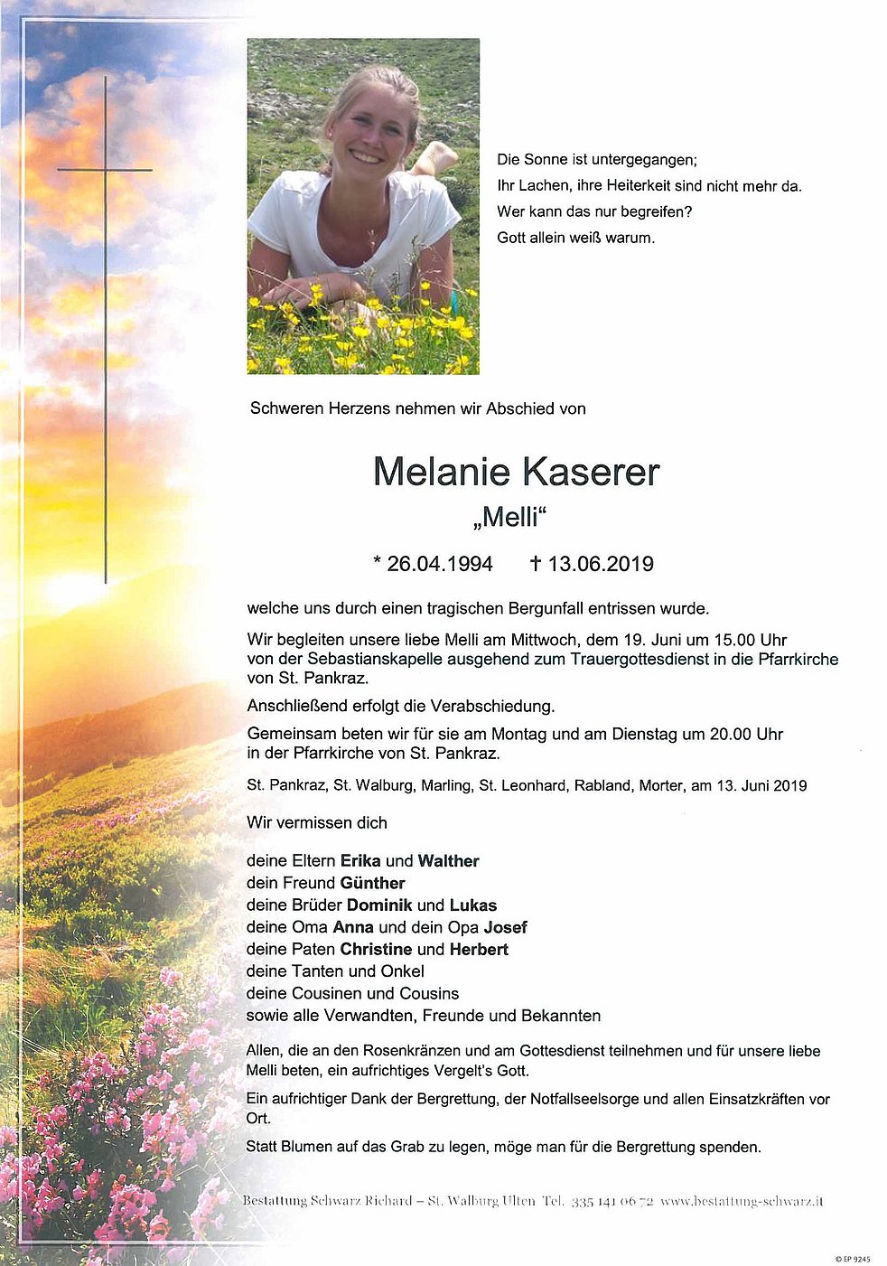 Auf der Spitznalm habe ich dich Walther mit Melanie gesehen;mit Freude und Begeisterung seit ihr über die Hochwart nach Hause gegangen. Den Weg, den Melanie jetzt geht, der ist für uns nicht begreiflich und stimmt uns unendlich traurig. Ich möchte allen mein tiefes Beleid ausdrücken.