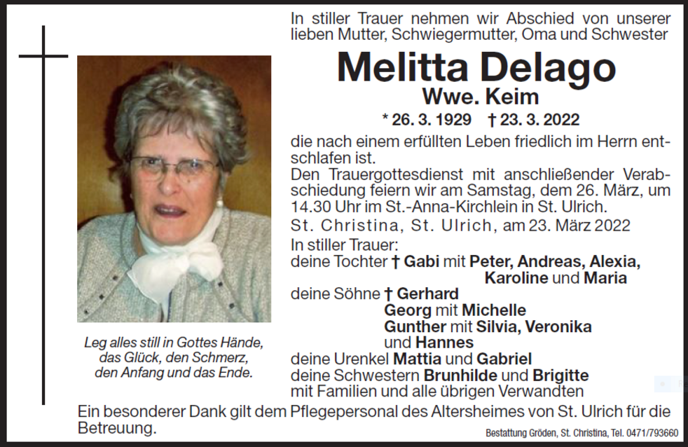 Den Trauergottesdienst mit anschließender Verabschiedung feiern wir am Samstag, dem 26. März, um 14.30 Uhr im St.-Anna-Kirchlein in St. Ulrich.