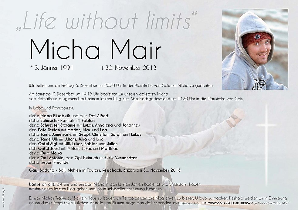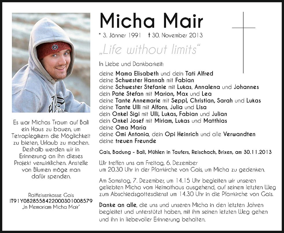 Es war Michas Traum auf Bali ein Haus zu bauen, um Tetraplegikern die Möglichkeit zu bieten, Urlaub zu machen. Deshalb werden wir in Erinnerung an ihn dieses Projekt verwirklichen. Anstelle von Blumen möge man dafür spenden. Raiffeisenkasse Gais IT91Y0828558422000301008579 „In Memoriam Micha Mair“