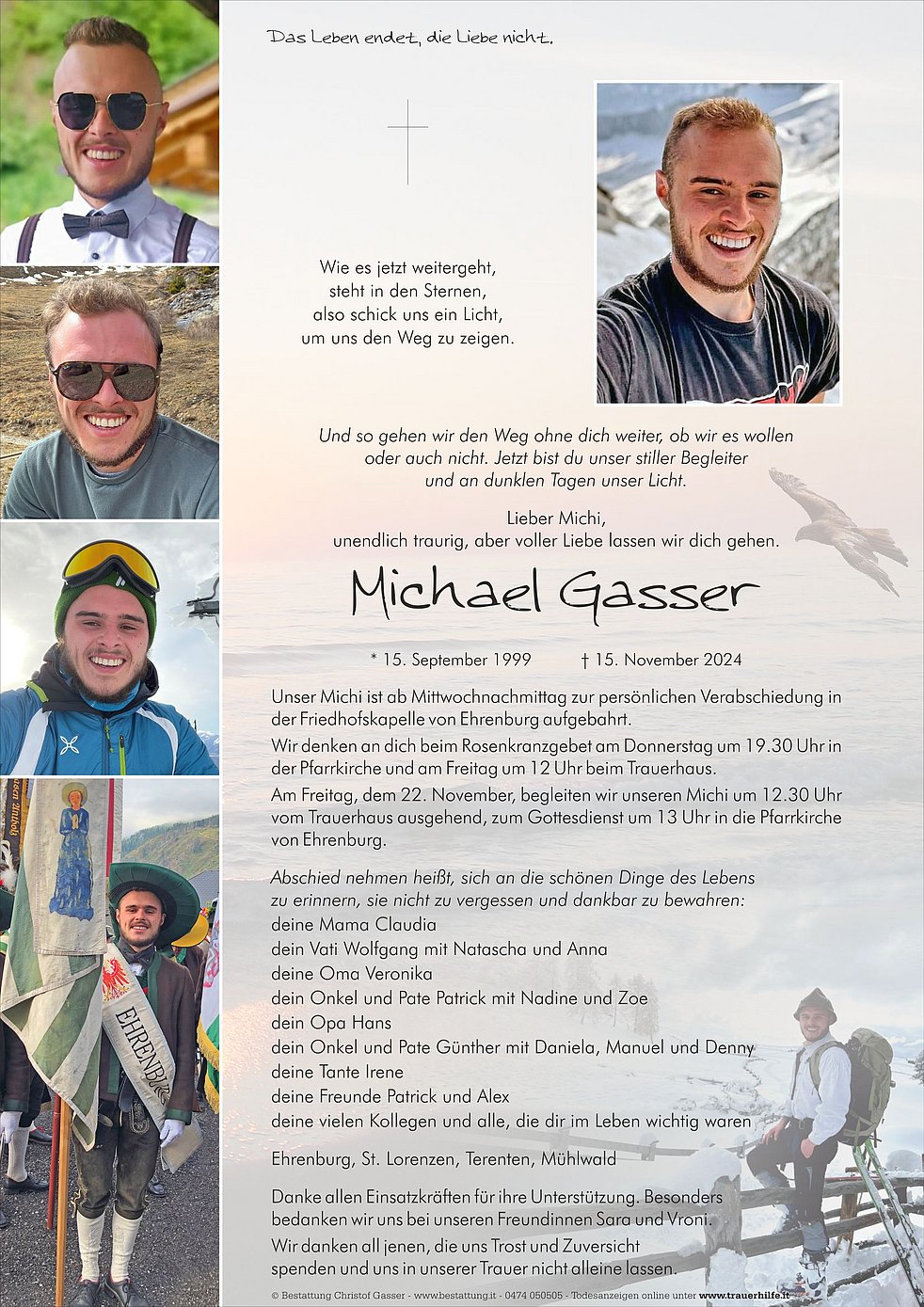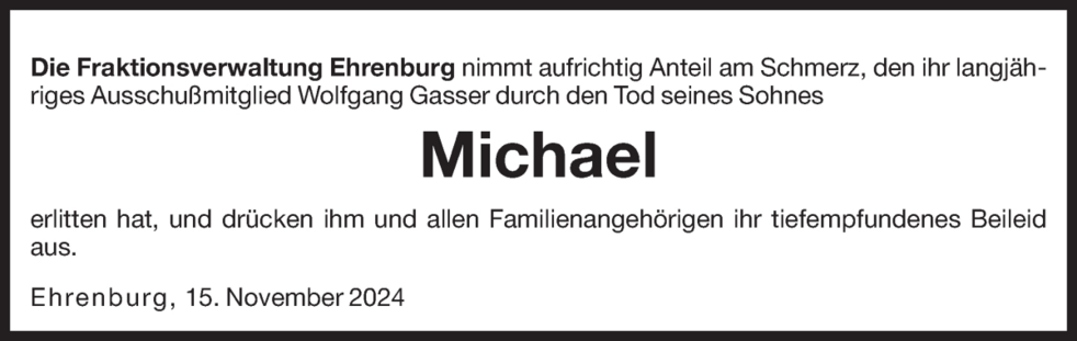 Am Freitag, dem 22. November, begleiten wir unseren Michi um 12.30 Uhr vom Trauerhaus ausgehend, zum Gottesdienst um 13 Uhr in die Pfarrkirche von Ehrenburg.