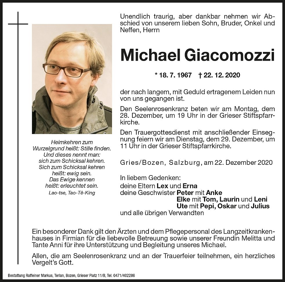 liebevolle Betreuung sowie unserer Freundin Melitta und Tante Anni für ihre Unterstützung und Begleitung unseres Michael.