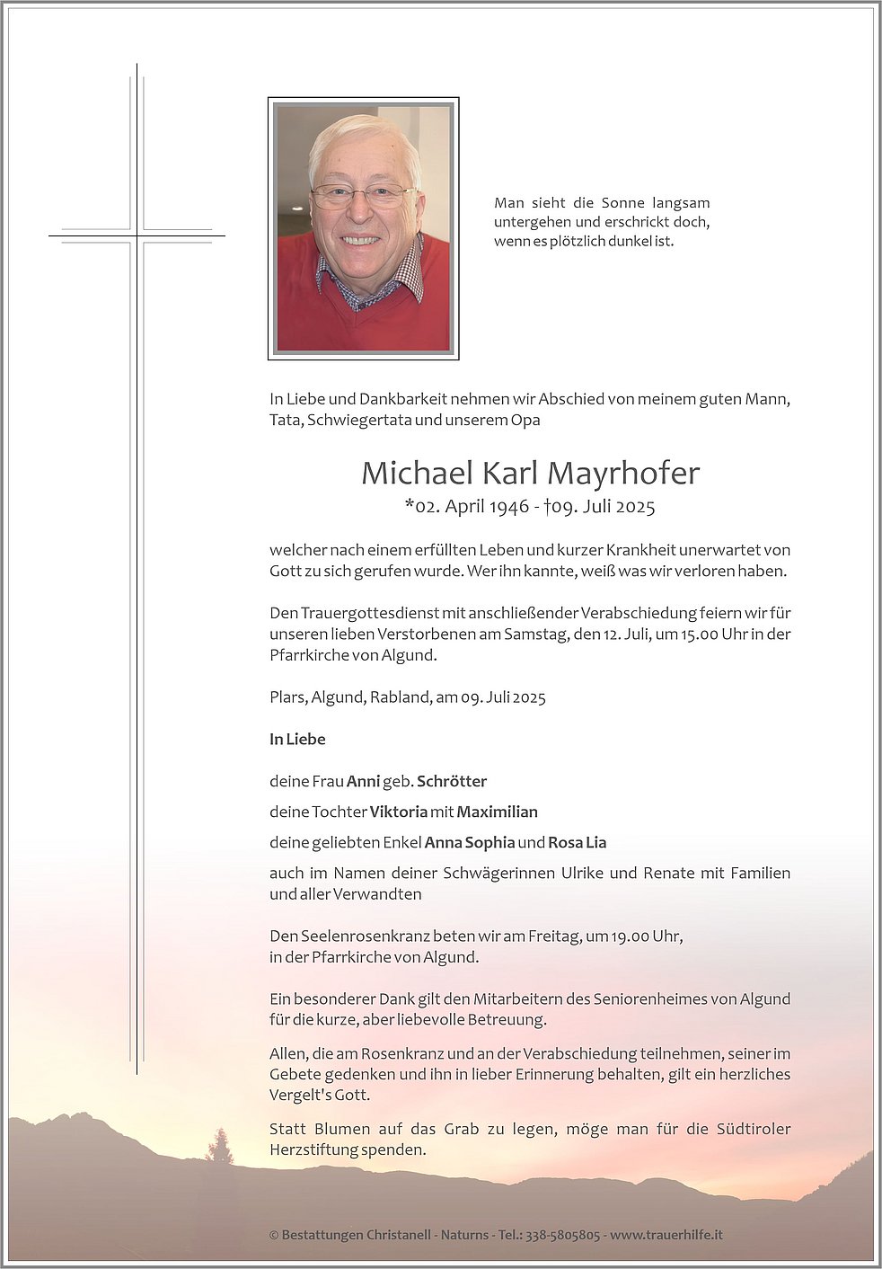 Den Trauergottesdienst mit anschließender Verabschiedung feiern wir für unseren lieben Verstorbenen am Samstag, den 12. Juli, um 15.00 Uhr in der Pfarrkirche von Algund.