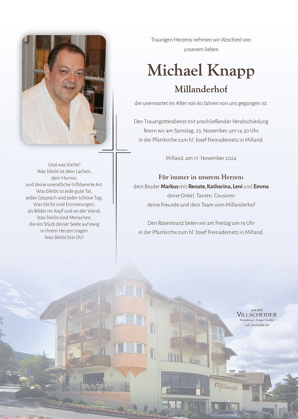 Lieber Michi, so manch Leckeres hast du immer wieder für den Sportverein auf die Teller gezaubert. Unvergessen bleibt deine freundliche Art die du allen Millandern entgegen gebracht hast. Ein großes Dankeschön gebührt dir dafür. Mach's gut im Köchehimmel. Lieber Markus mit Familie, wir sprechen euch unser tiefempfundenes Beileid aus und wünschen euch viel Kraft in dieser schweren Zeit.