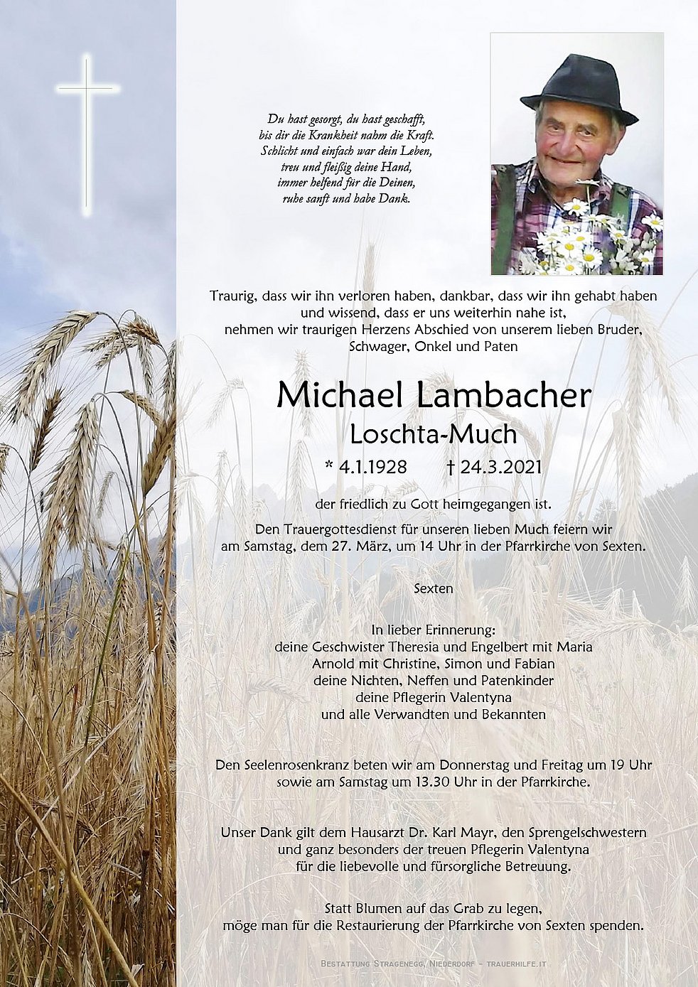 Den Trauergottesdienst für unseren lieben Much feiern wir am Samstag, dem 27. März, um 14 Uhr in der Pfarrkirche von Sexten.