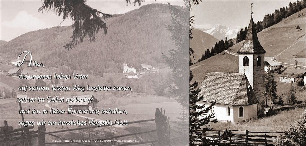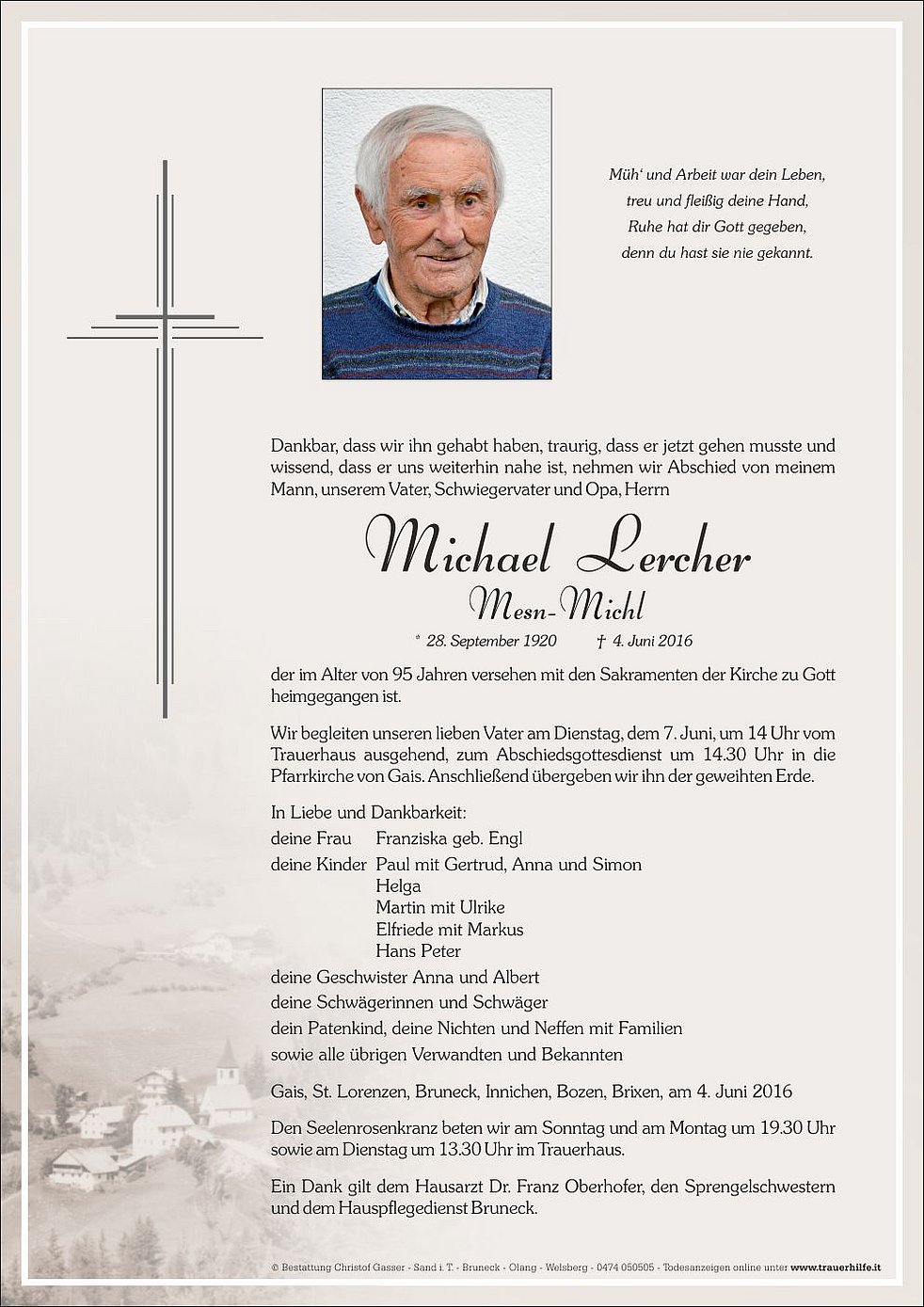 Wir begleiten unseren lieben Vater am Dienstag, dem 7. Juni, um 14 Uhr vom Trauerhaus ausgehend, zum Abschiedsgottesdienst um 14.30 Uhr in die Pfarrkirche von Gais. Anschließend übergeben wir ihn der geweihten Erde.
