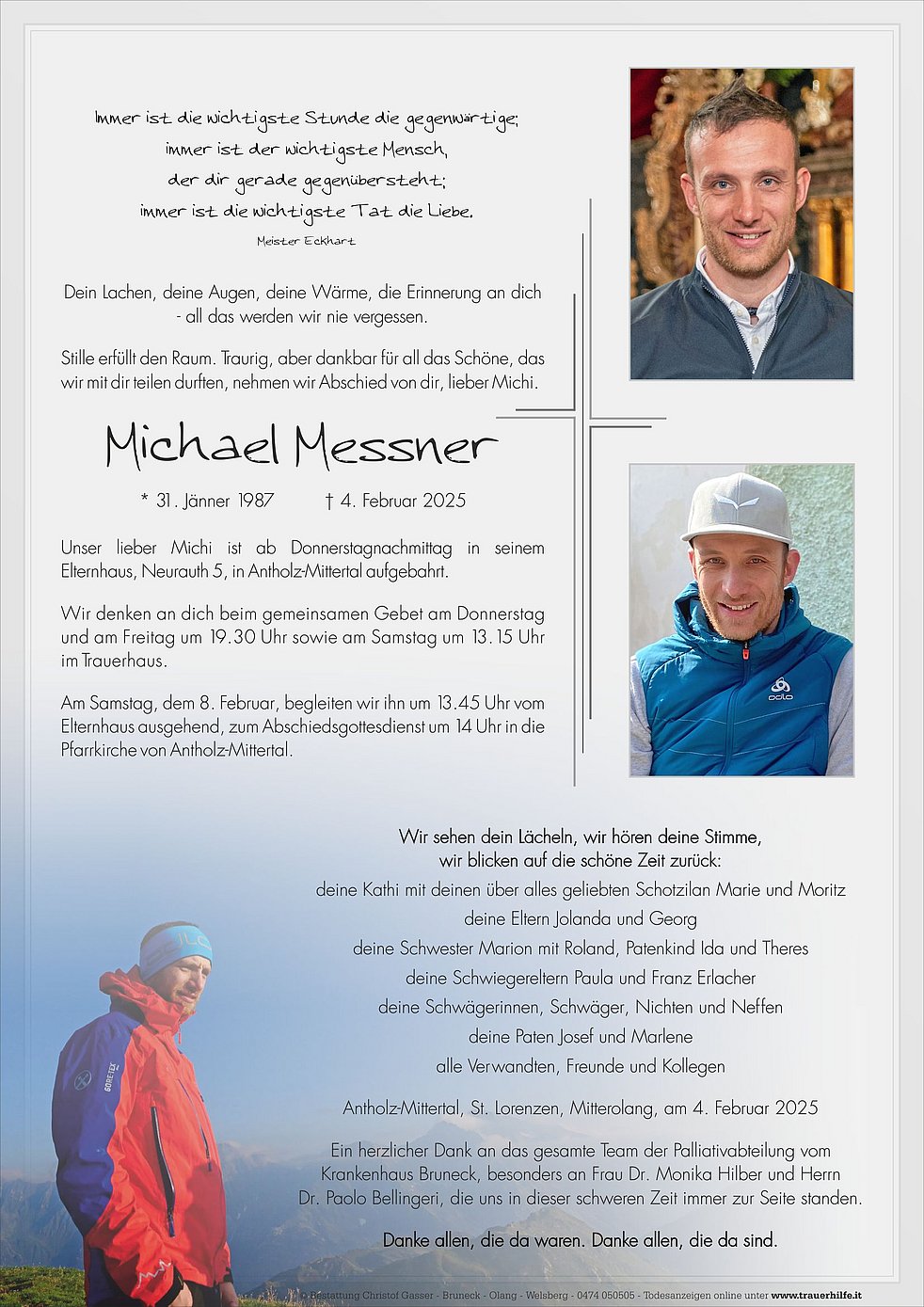 Am Samstag, dem 8. Februar, begleiten wir ihn um 13.45 Uhr vom Elternhaus ausgehend, zum Abschiedsgottesdienst um 14 Uhr in die Pfarrkirche von Antholz-Mittertal.