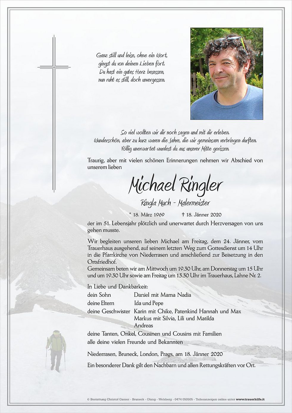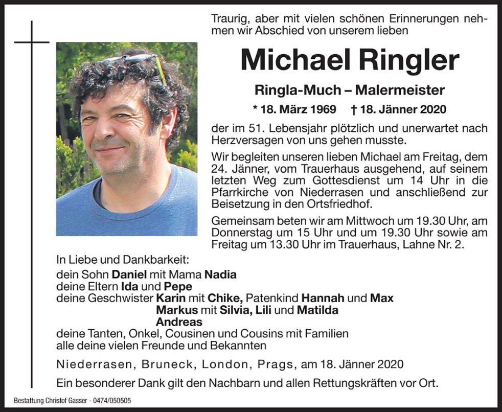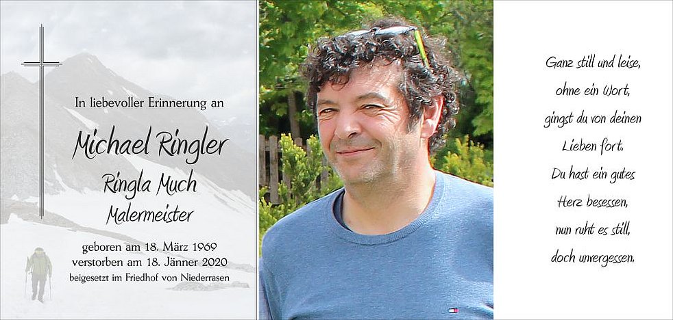 Wir begleiten unseren lieben Michael am Freitag, dem 24. Jänner, vom Trauerhaus ausgehend, auf seinem letzten Weg zum Gottesdienst um 14 Uhr in die Pfarrkirche von Niederrasen und anschließend zur Beisetzung in den Ortsfriedhof.
