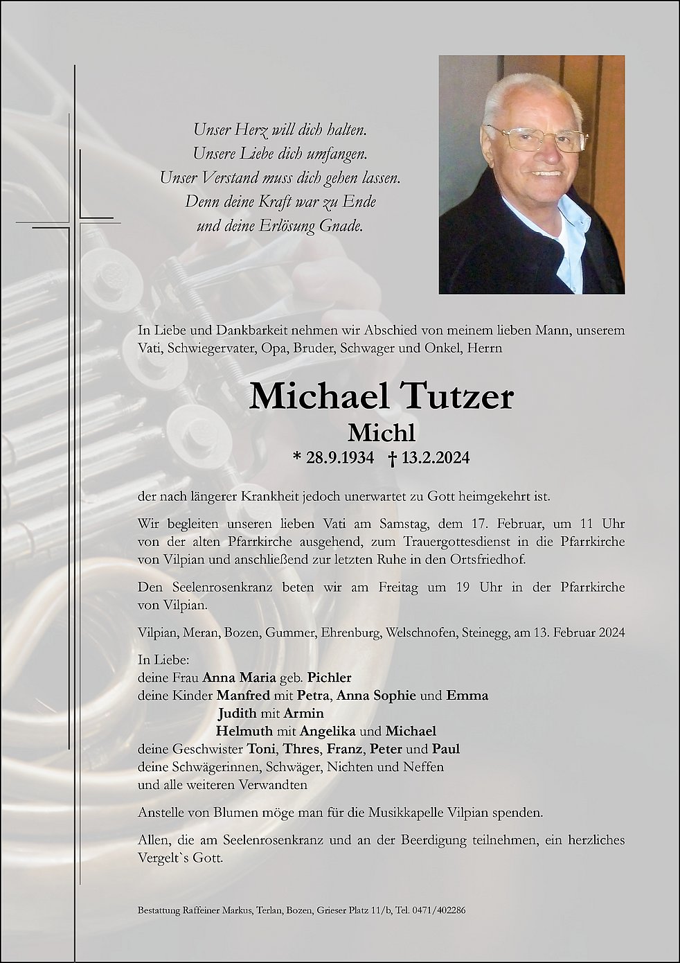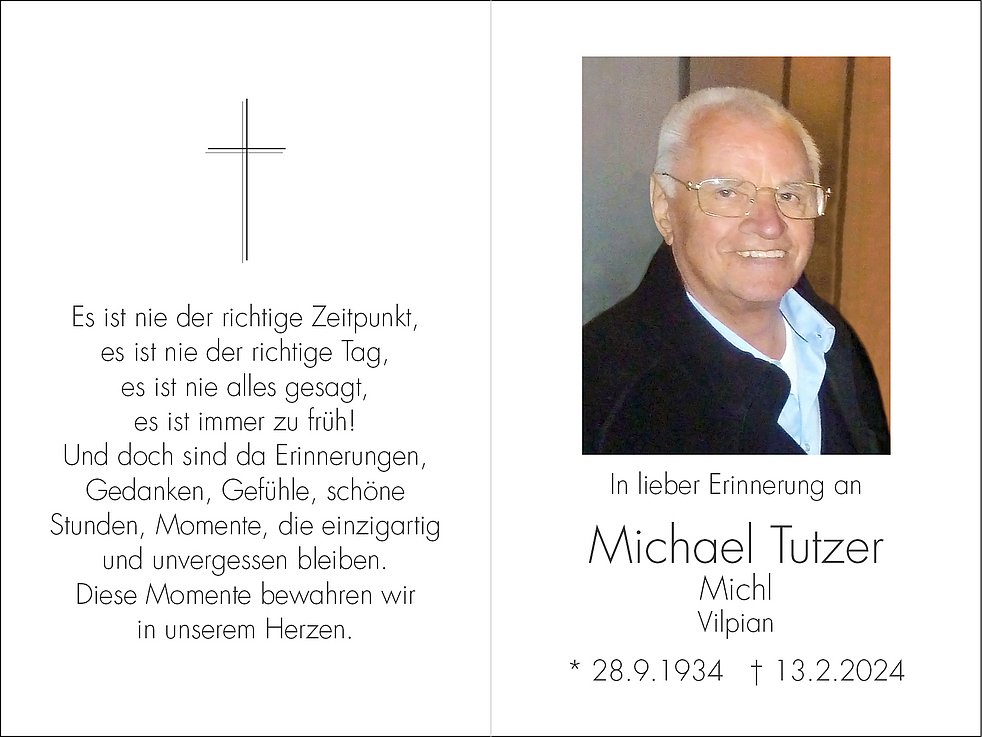 Wir begleiten unseren lieben Vati am Samstag, dem 17. Februar, um 11 Uhr von der alten Pfarrkirche ausgehend, zum Trauergottesdienst in die Pfarrkirche von Vilpian und anschließend zur letzten Ruhe in den Ortsfriedhof.