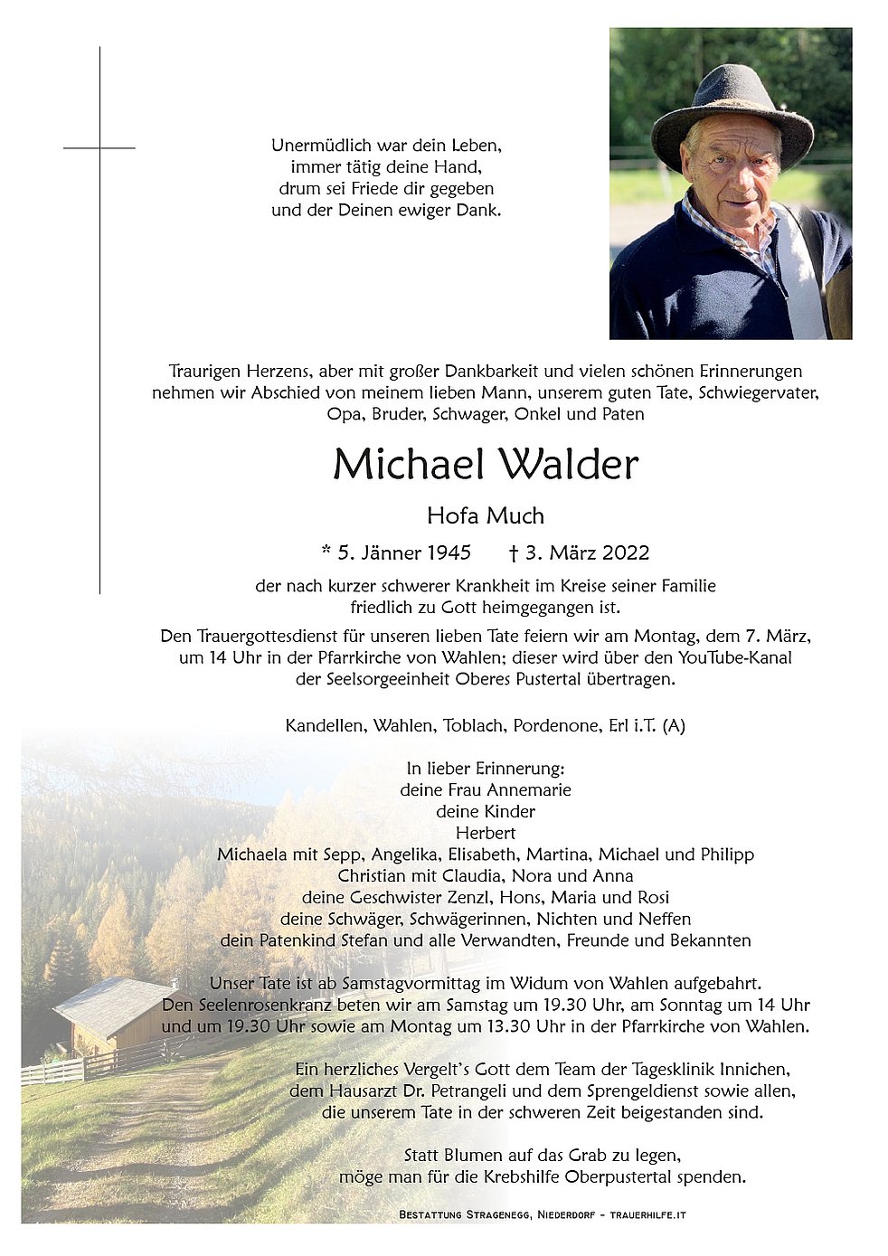 Den Trauergottesdienst für unseren lieben Tate feiern wir am Montag, dem 7. März, um 14 Uhr in der Pfarrkirche von Wahlen; dieser wird über den YouTube-Kanal der Seelsorgeeinheit Oberes Pustertal übertragen.