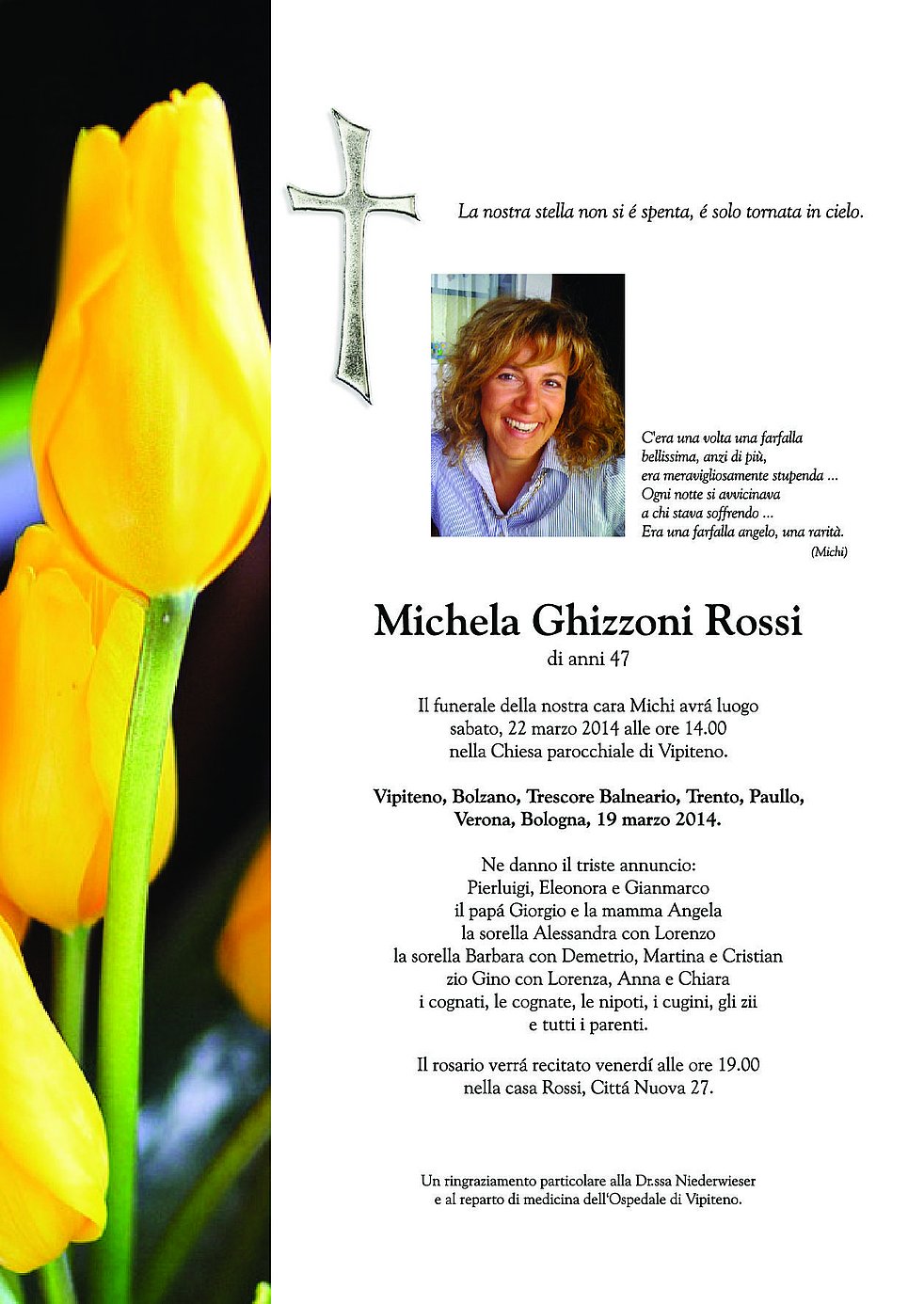 Il funerale della nostra cara Michi avrá luogo sabato, 22 marzo