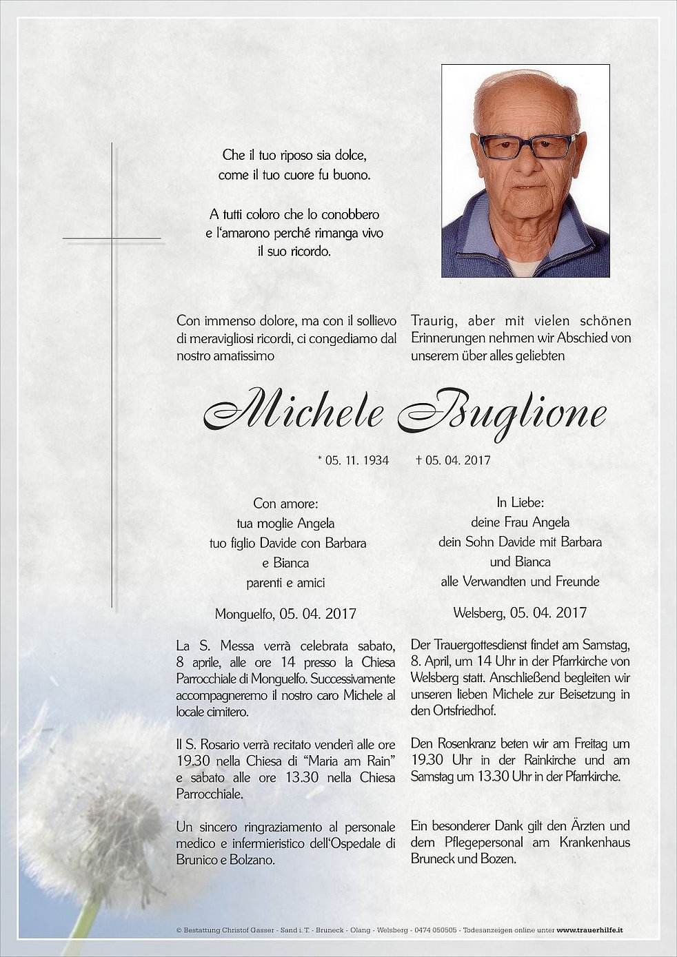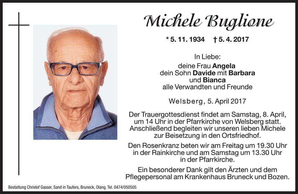Der Trauergottesdienst findet am Samstag, 8. April, um 14 Uhr in der Pfarrkirche von Welsberg statt. Anschließend begleiten wir unseren lieben Michele zur Beisetzung in den Ortsfriedhof.