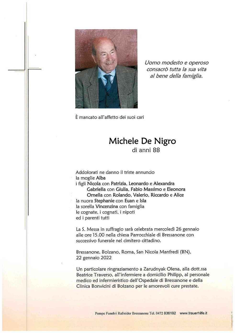 La S. Messa in suffragio sarà celebrata mercoledì 26 gennaio alle ore 15.00 nella chiesa Parrocchiale di Bressanone con successivo funerale nel cimitero cittadino.