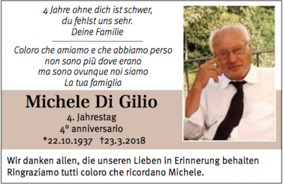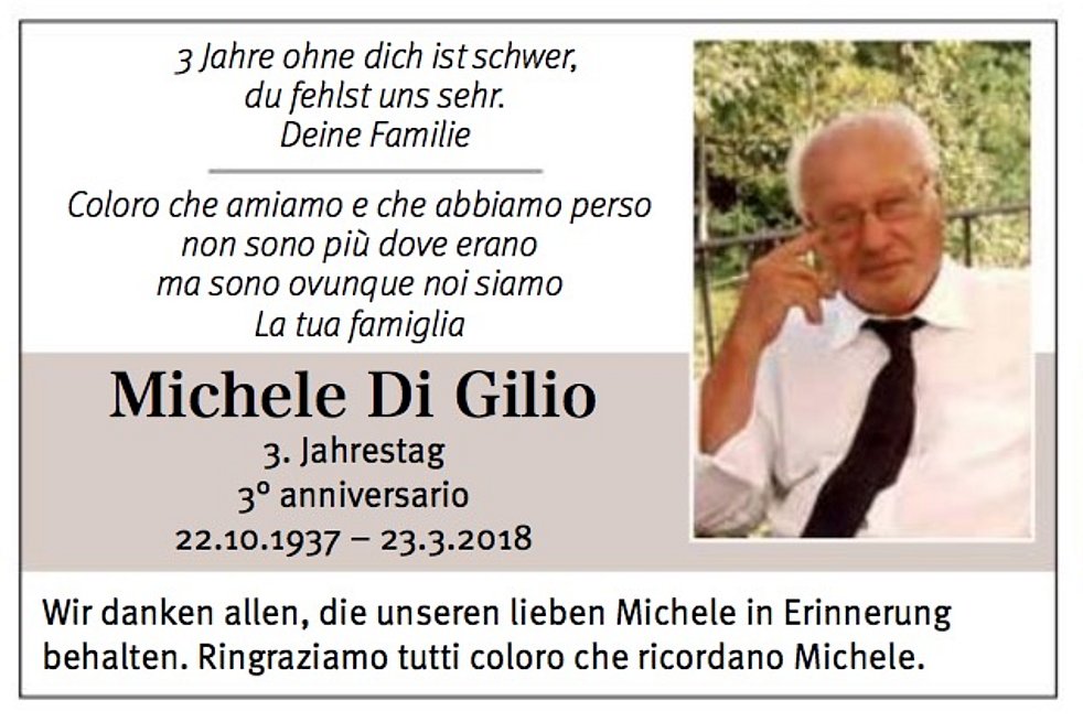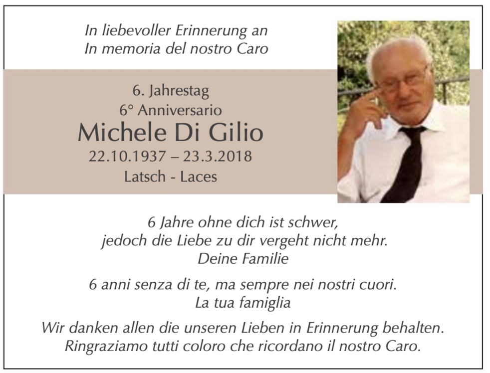 Am Montag, 26. März, um 13.30 Uhr beten wir den Rosenkranz; um 14 Uhr feiern wir den Begräbnisgottesdienst in der Pfarrkirche von Latsch; anschließend erfolgt die Beisetzung im Ortsfriedhof.