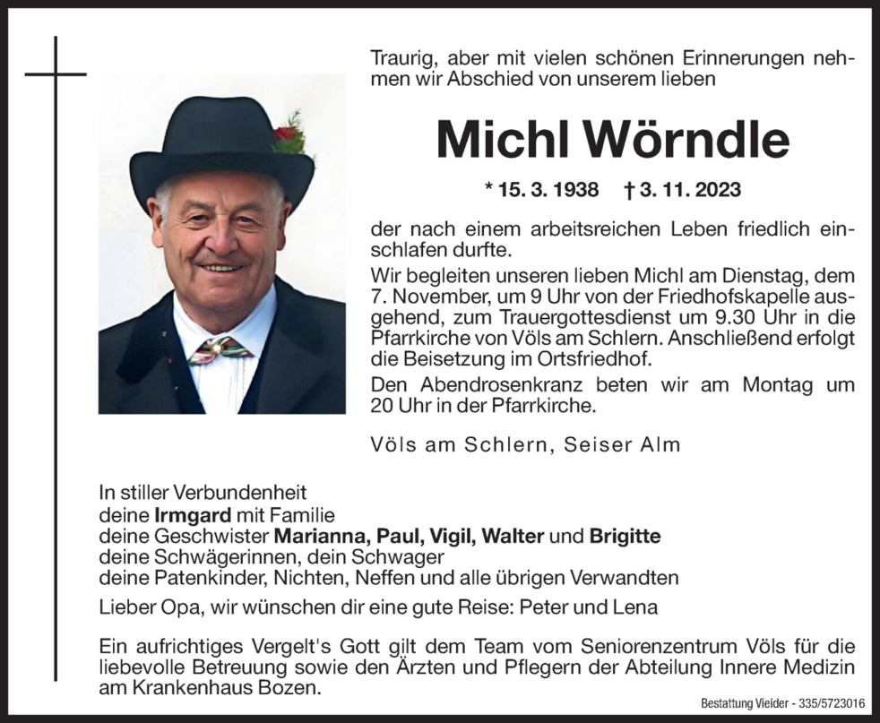 Wir begleiten unseren lieben Michl am Dienstag, dem 7. November um 9 Uhr von der Friedhofskapelle ausgehend, zum Trauergottesdienst um 9.30 Uhr in die Pfarrkirche von Völs am Schlern. Anschließend erfolgt die Beisetzung im Ortsfriedhof.