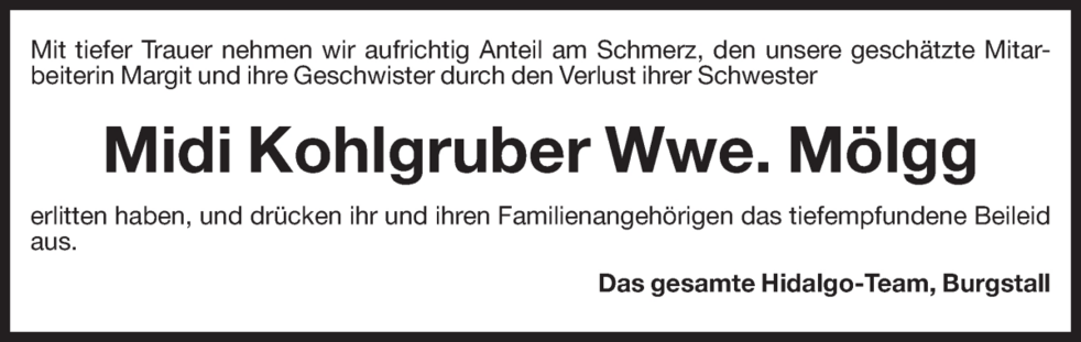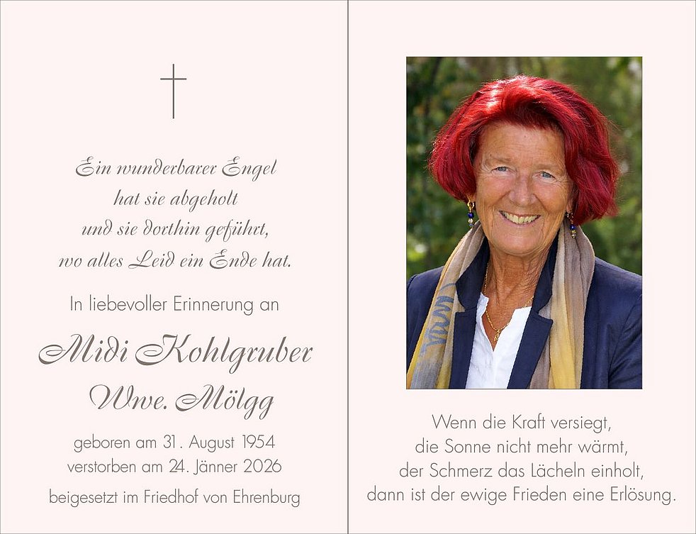 Unsere liebe Midi ist ab Montagabend bis Mittwochmittag im Trauerhaus, Treitling Nr. 3, aufgebahrt.