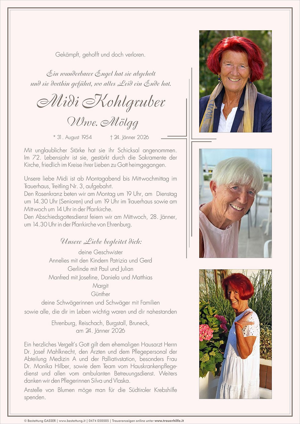 Anstelle von Blumen möge man für die Südtiroler Krebshilfe spenden.