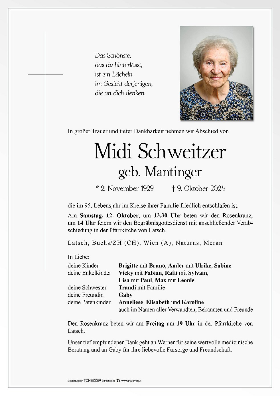 Am Samstag, 12. Oktober, um 13.30 Uhr beten wir den Rosenkranz; um 14 Uhr feiern wir den Begräbnisgottesdienst mit anschließender Verabschiedung in der Pfarrkirche von Latsch.