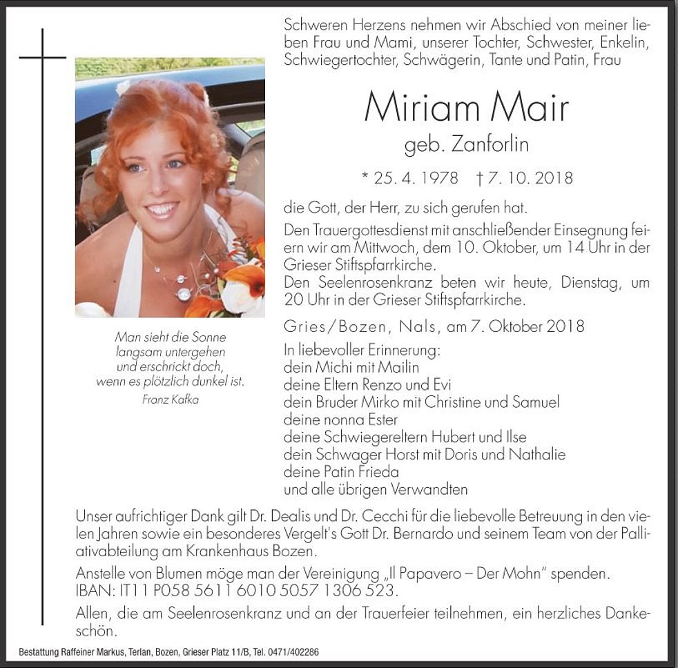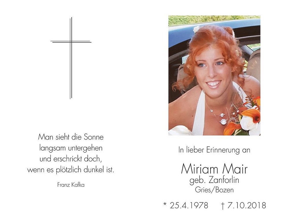 Anstelle von Blumen möge man der Vereinigung Il Papavero – Der Mohn spenden. IBAN: IT11P0585611601050571306523