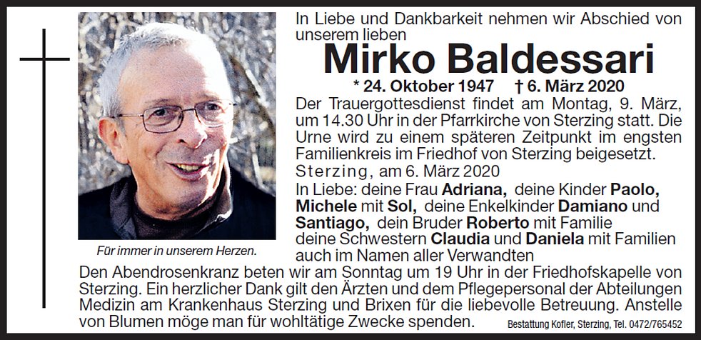 Die Urne wird zu einem späteren Zeitpunkt im engsten Familienkreis im Friedhof von Sterzing beigesetzt.