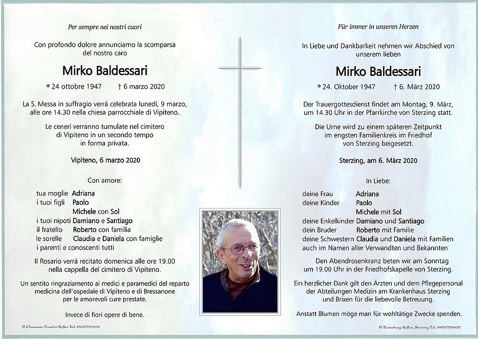 Un sentito ringraziamento ai medici e paramedici del reparto medicina dell‘ospedale di Vipiteno e di Bressanone per le amorevoli cure prestate.