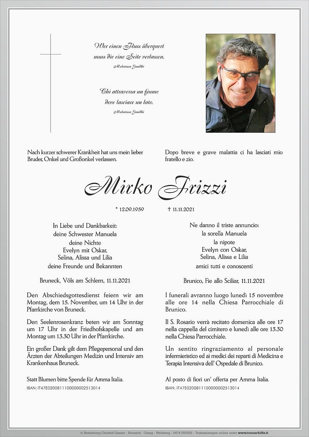 Den Abschiedsgottesdienst feiern wir am Montag, dem 15. November, um 14 Uhr in der Pfarrkirche von Bruneck.
