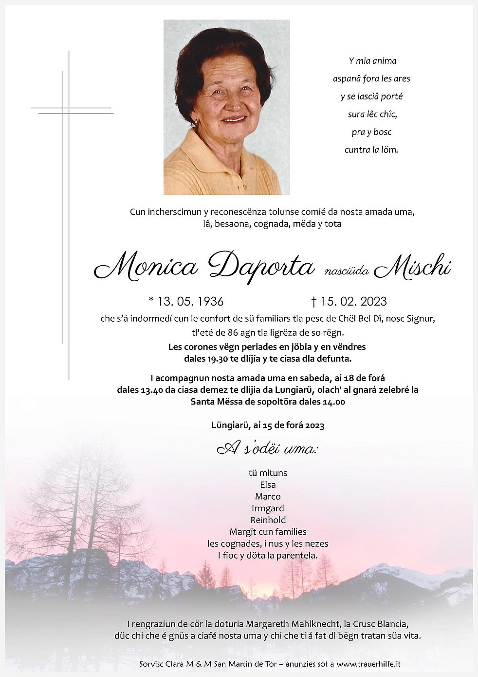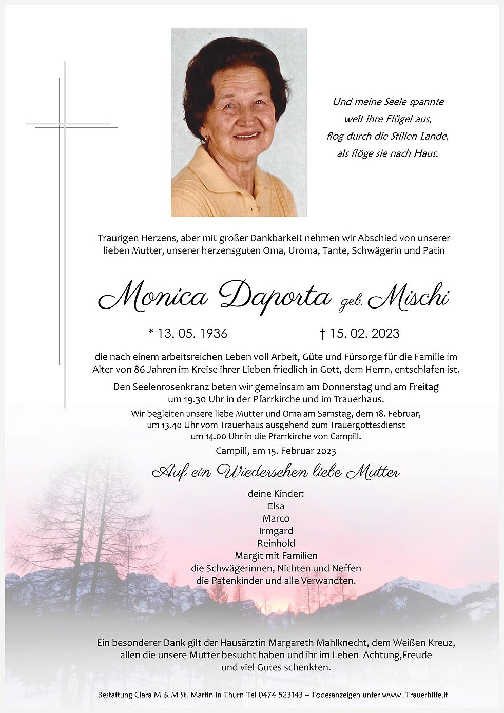 Wir begleiten unsere liebe Mutter und Oma am Samstag, dem 18. Februar, um 13.40 Uhr vom Trauerhaus ausgehend zum Trauergottesdienst um 14.00 Uhr in die Pfarrkirche von Campill.