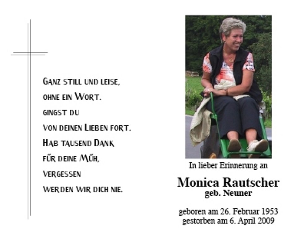Den Trauergottesdienst feiern wir am Mittwoch, dem 8. April, um 9.45 Uhr in der Grieser Stiftspfarrkirche; anschließend um 11 Uhr begleiten wir unsere liebe Monica zur letzten Ruhe auf den städtischen Friedhof von Bozen – Oberau, ausgehend von der Friedhofskapelle.