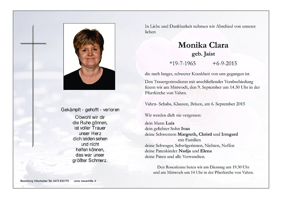 Den Trauergottesdienst mit anschließender Verabschiedung feiern wir am Mittwoch, den 9. September um 14.30 Uhr in der Pfarrkirche von Vahrn.