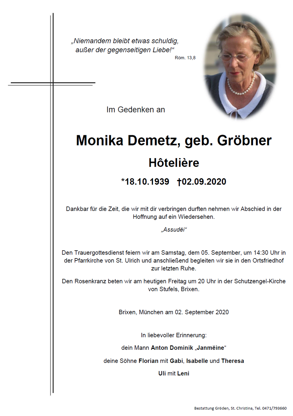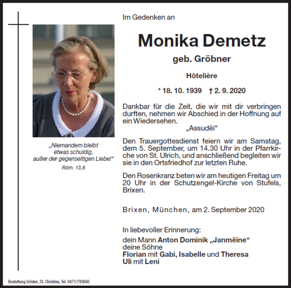 Den Trauergottesdienst feiern wir am Samstag, dem 05. September, um 14:30 Uhr in der Pfarrkirche von St. Ulrich und anschließend begleiten wir sie in den Ortsfriedhof zur letzten Ruhe.
