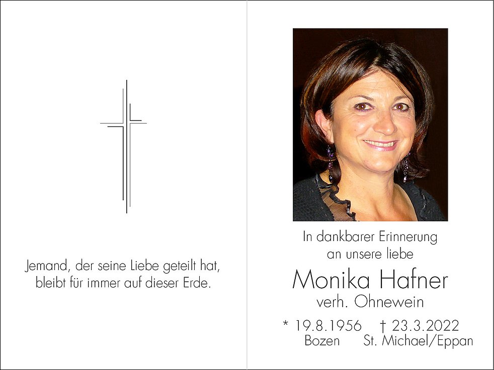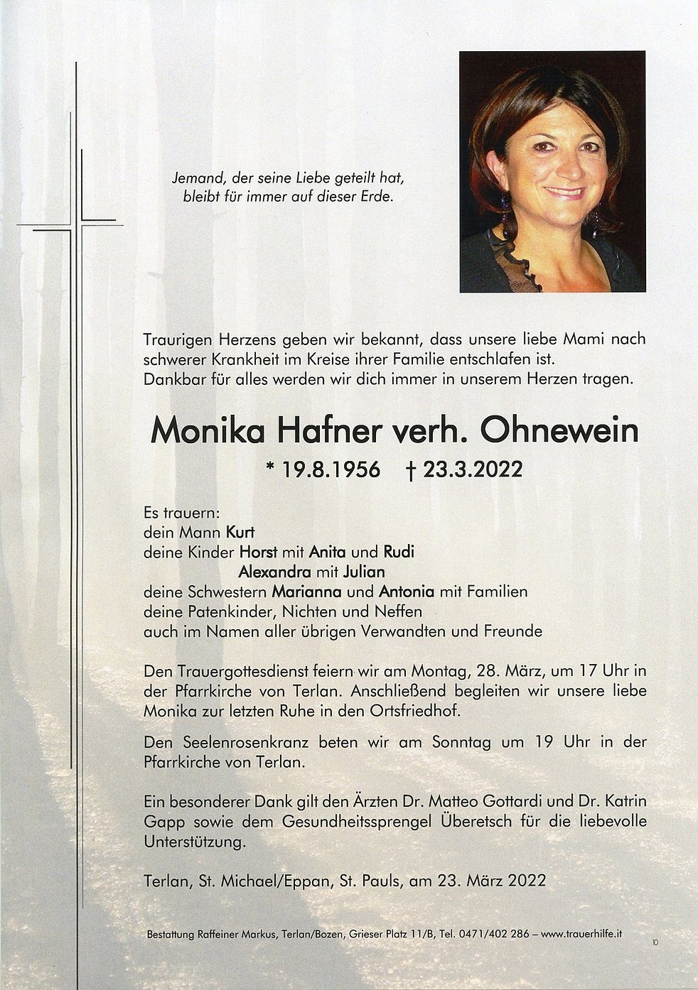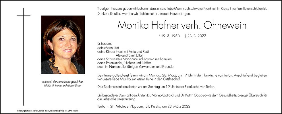 Den Trauergottesdienst feiern wir am Montag, 28. März, um 17 Uhr in der Pfarrkirche von Terlan. Anschließend begleiten wir unsere liebe Monika zur letzten Ruhe in den Ortsfriedhof.