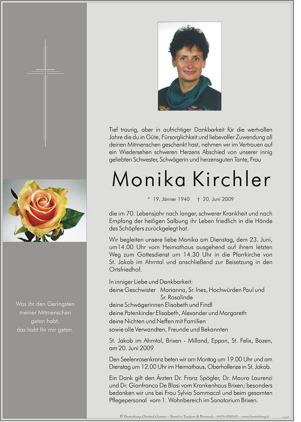 Wir begleiten unsere liebe Monika am Dienstag, dem 23. Juni, um14.00 Uhr vom Heimathaus ausgehend auf ihrem letzten Weg zum Gottesdienst um 14.30 Uhr in die Pfarrkirche von