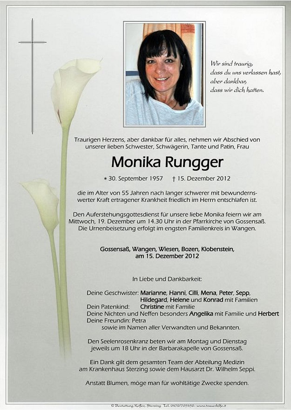 Anstatt Blumen, möge man für wohltätige Zwecke spenden.