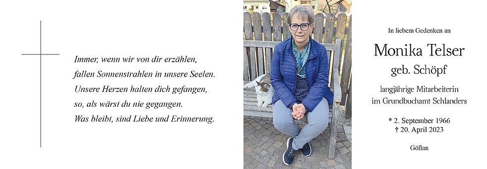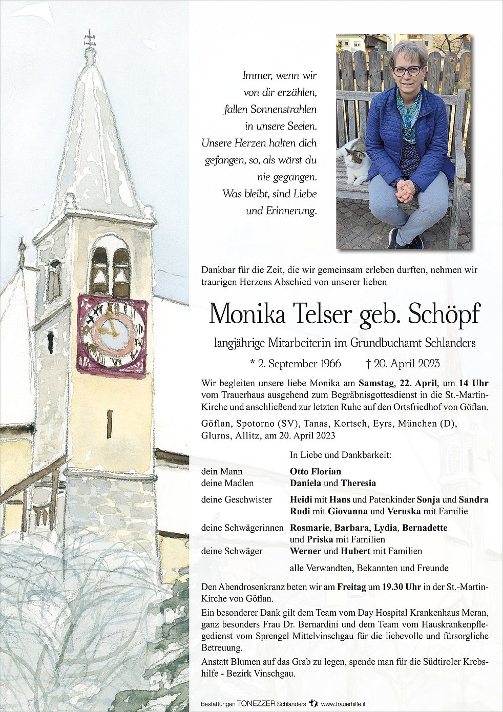 Wir begleiten unsere liebe Monika am Samstag, 22. April, um 14 Uhr vom Trauerhaus ausgehend zum Begräbnisgottesdienst in die St.-Martin-Kirche und anschließend zur letzten Ruhe auf den Ortsfriedhof von Göflan.
