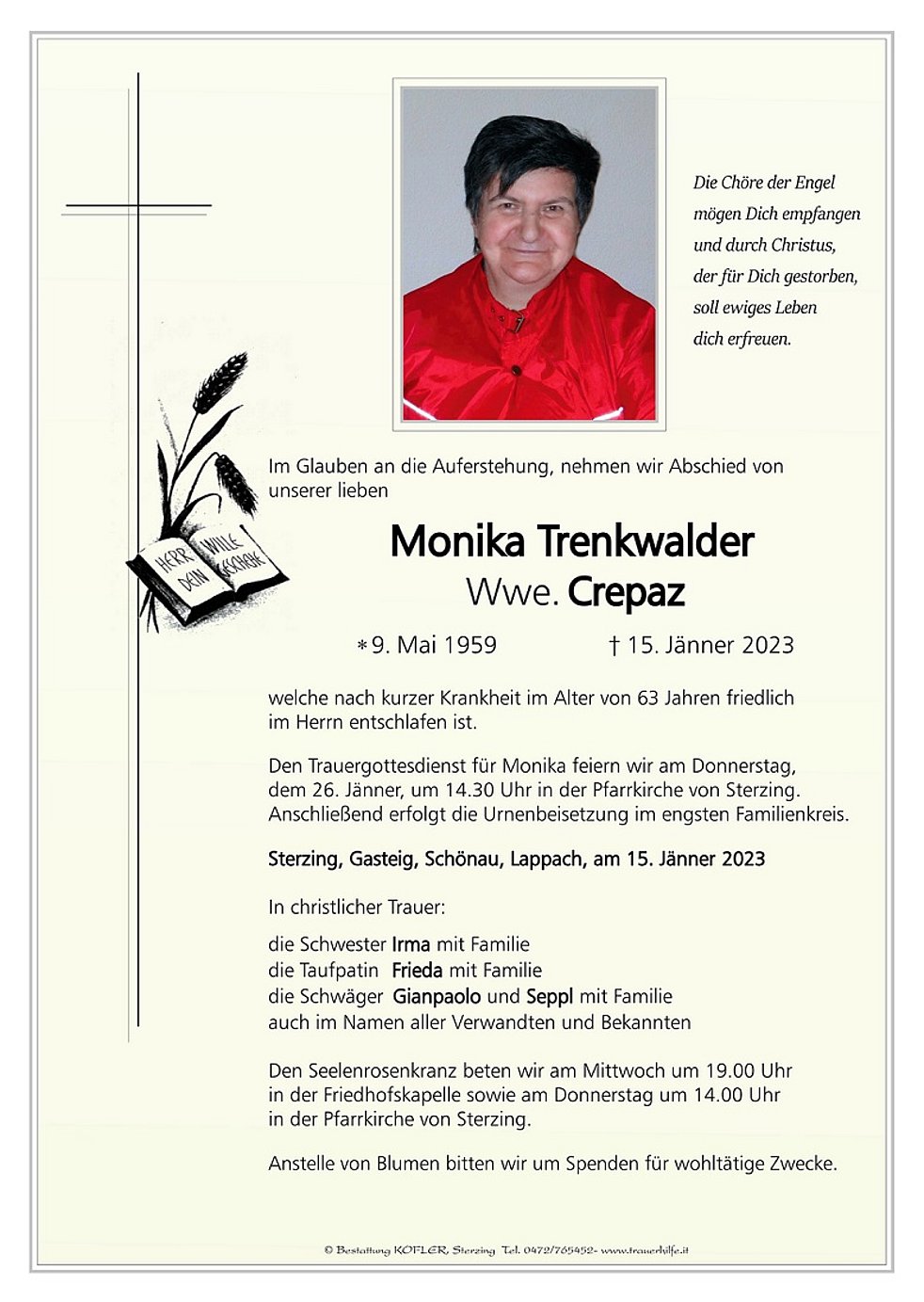 Den Trauergottesdienst für Monika feiern wir am Donnerstag, dem 26. Jänner, um 14.30 Uhr in der Pfarrkirche von Sterzing. Anschließend erfolgt die Urnenbeisetzung im engsten Familienkreis.