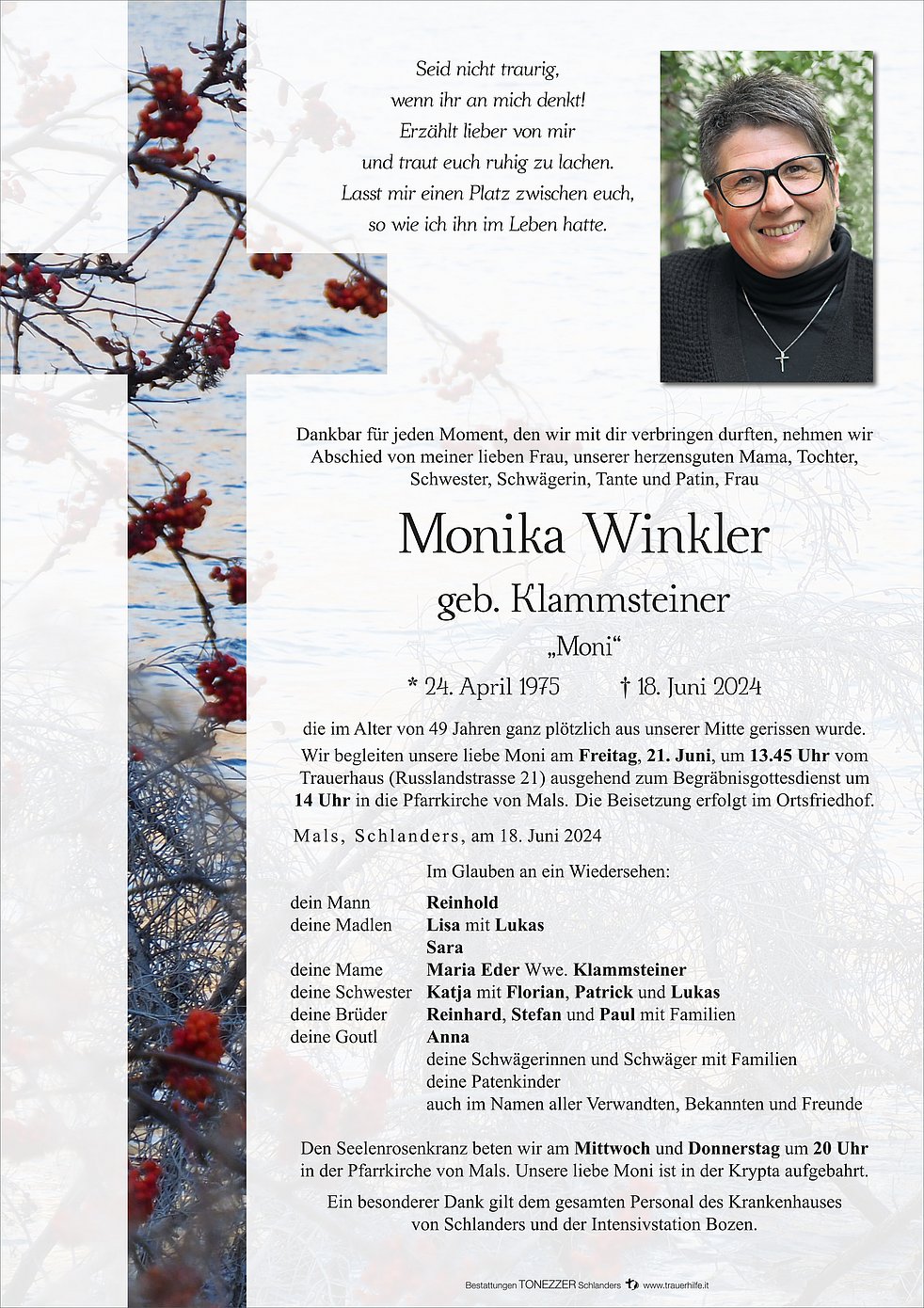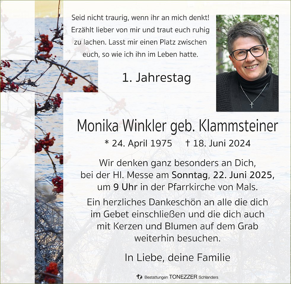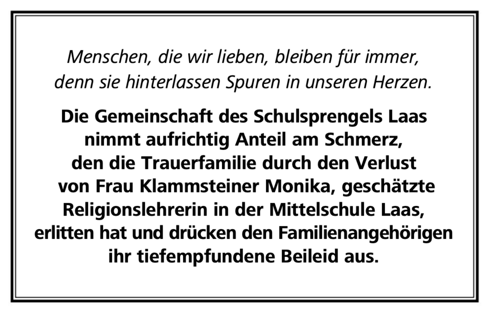 Moni i woar gestern in Loos bei ar Hochzeit am Abend und hon mr gedenkt i will die unbedingt treffn iats wemmr Ferien hobm. Mir hobm ins seitn 9. Juni niamr keart du hosch affuamol niamr zruggschriebm, weil i so ingsponnt woar seitn 1.Juni, honi olleweil wieder gedenkt an di obr mir nichts dabei gedenkt... Hon nr gestern die Laaser Bürgermeisterin noch dir gfrogg, weil sie jo a Learorin giwesn isch, nr hot sie mir gsogg, dass du heint beerdigt worden bisch. I woar fassungslos. I hon nicht giwisst... Des glabi honi gspiart du hosch mir des sogn giwellt ... Es tuat mir wea, dass mir ins niamr hearn und niamr sechn kennen. Du bisch für mi a Vorbild a Powerfrau und a Mensch mit dem man Pferde stehln konn,der sich für seine Überzeugungen insetzt und ders schofft Menschn zu begeistern. Mir follt do es Schiff in und die Stundn de se dir nit gstrichn hobm in dr Schule. Wenn jemand a super Relililearorin woar, nr du für mi.... Du woarsch meine Kollegin mir hobm ins bei ar Fortbildung kennen gelernt und hobm vor kop, nou einige mitnonder zu mochn, du hosch mir ollbm wieder an Rot gebm, hosch mr weiter kolfn mit deiner Sicht der Dinge. Moni du wearsch mir fahln... Bin mr sichr du schaugsch af deine Madler und af dein Monn und deine Lieben. Mochs guat du Powerfrau