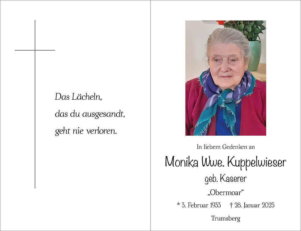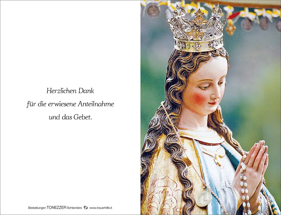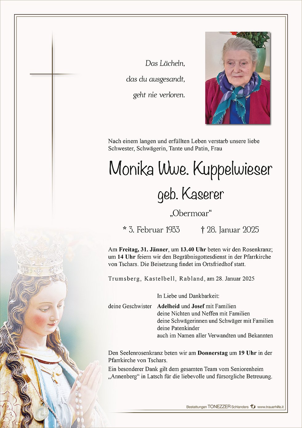 Begräbnisgottesdienst: 31.01. - 14:00 Uhr Pfarrkirche von Tschars
