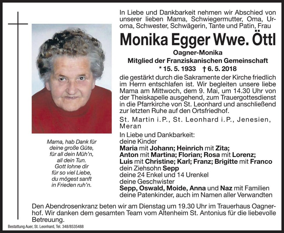 Wir begleiten unsere liebe Mama am Mittwoch, dem 9. Mai, um 14.30 Uhr von der Theiskapelle ausgehend, zum Trauergottesdienst in die Pfarrkirche von St. Leonhard und anschließend zur letzten Ruhe auf den Ortsfriedhof.