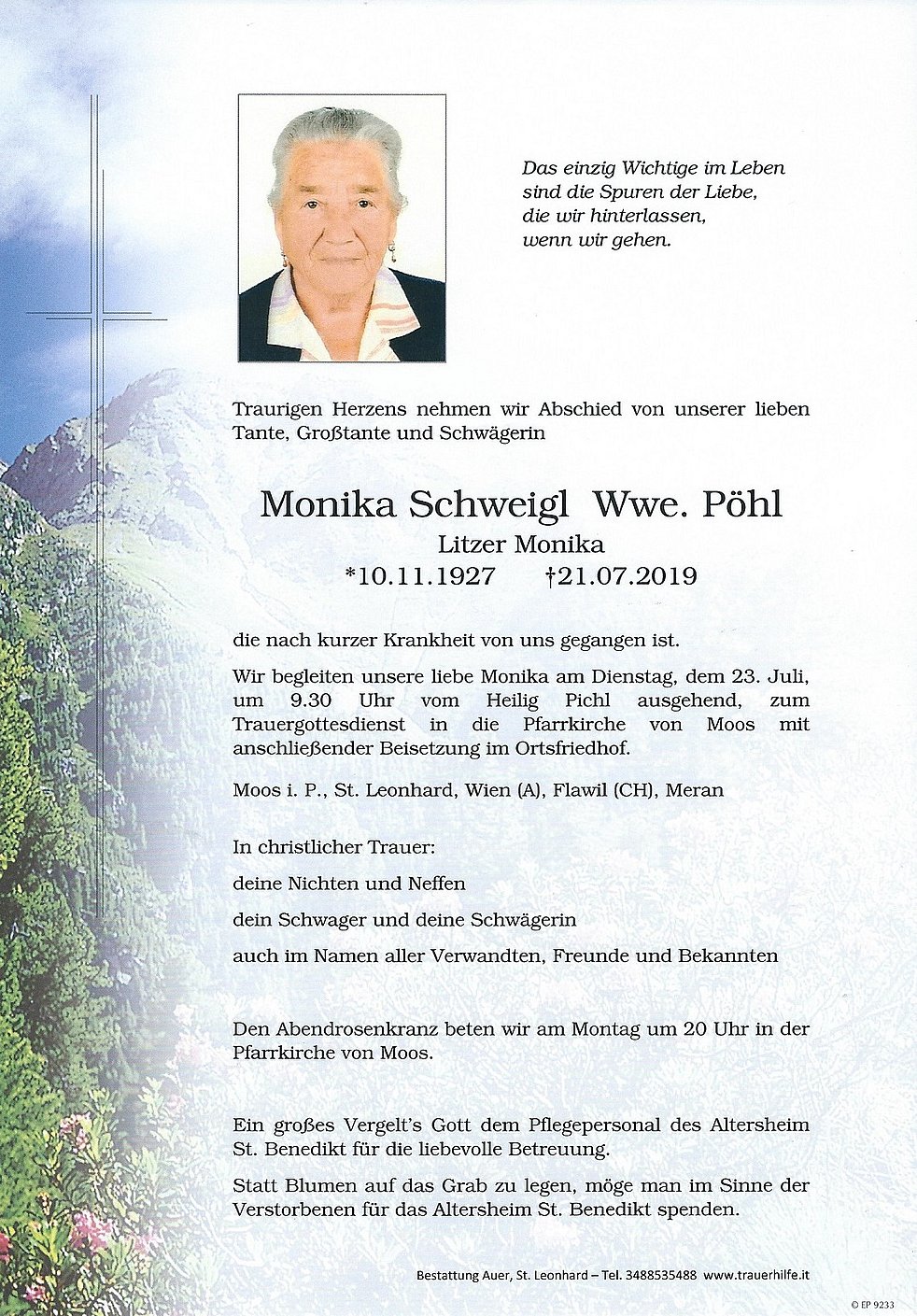 Wir begleiten unsere liebe Monika am Dienstag, dem 23. Juli, um 9.30 Uhr vom Heilig Pichl ausgehend, zum Trauergottesdienst in die Pfarrkirche von Moos mit anschließender Beisetzung im Ortsfriedhof.