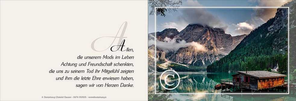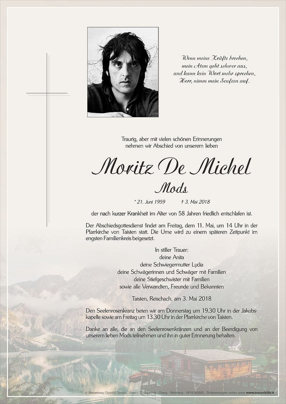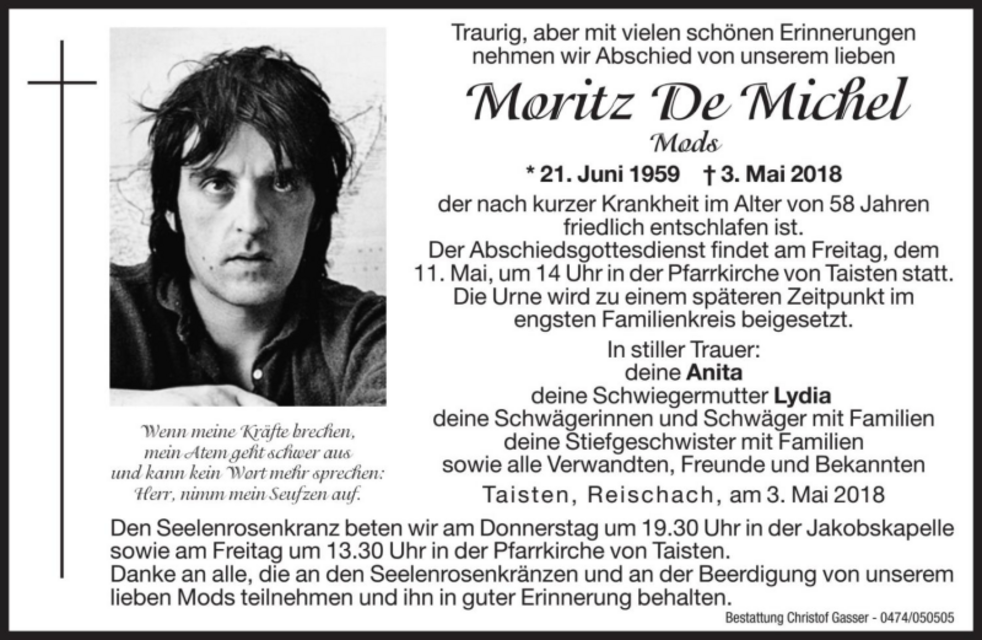 Der Abschiedsgottesdienst findet am Freitag, dem 11. Mai, um 14 Uhr in der Pfarrkirche von Taisten statt. Die Urne wird zu einem späteren Zeitpunkt im engsten Familienkreis beigesetzt.