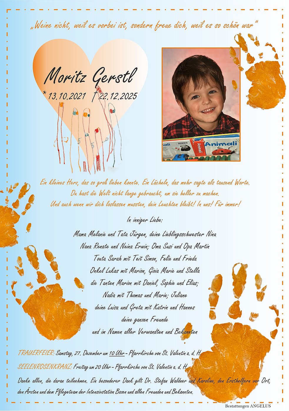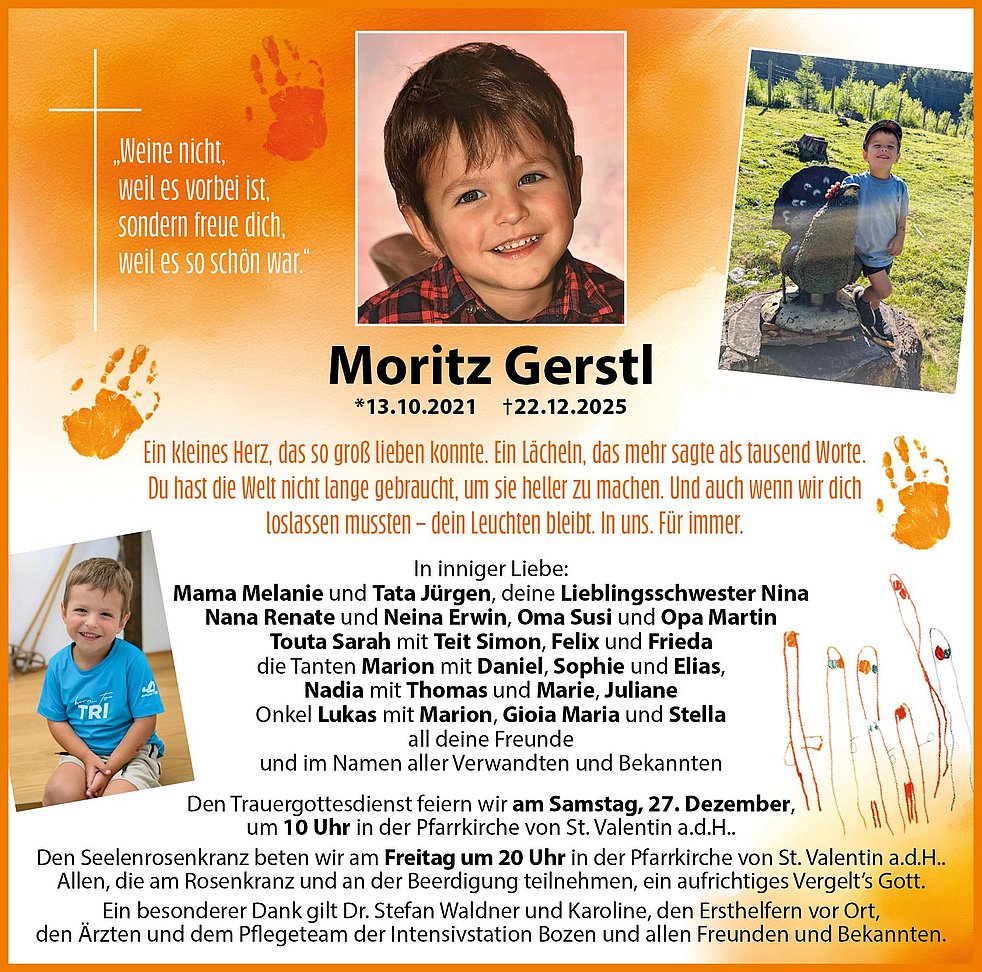 Lieber Moritz, du wunderschöner kleiner Engel, ich hoffe und wünsche mir von Herzen, dass du dort, wo du jetzt bist, behütet und geborgen bist. Mögen die kostbaren Erinnerungen an die vielen unvergesslichen Momente mit dir und an dein strahlendes Lächeln für deine Eltern, deine kleine Schwester Nina, deinen Neina und alle deine Angehörigen und Freunde in dieser schweren Zeit leuchten wie helle Sterne und ihnen die Kraft geben, auch weiterhin zusammenzuhalten und ihren Weg weiterzugehen.