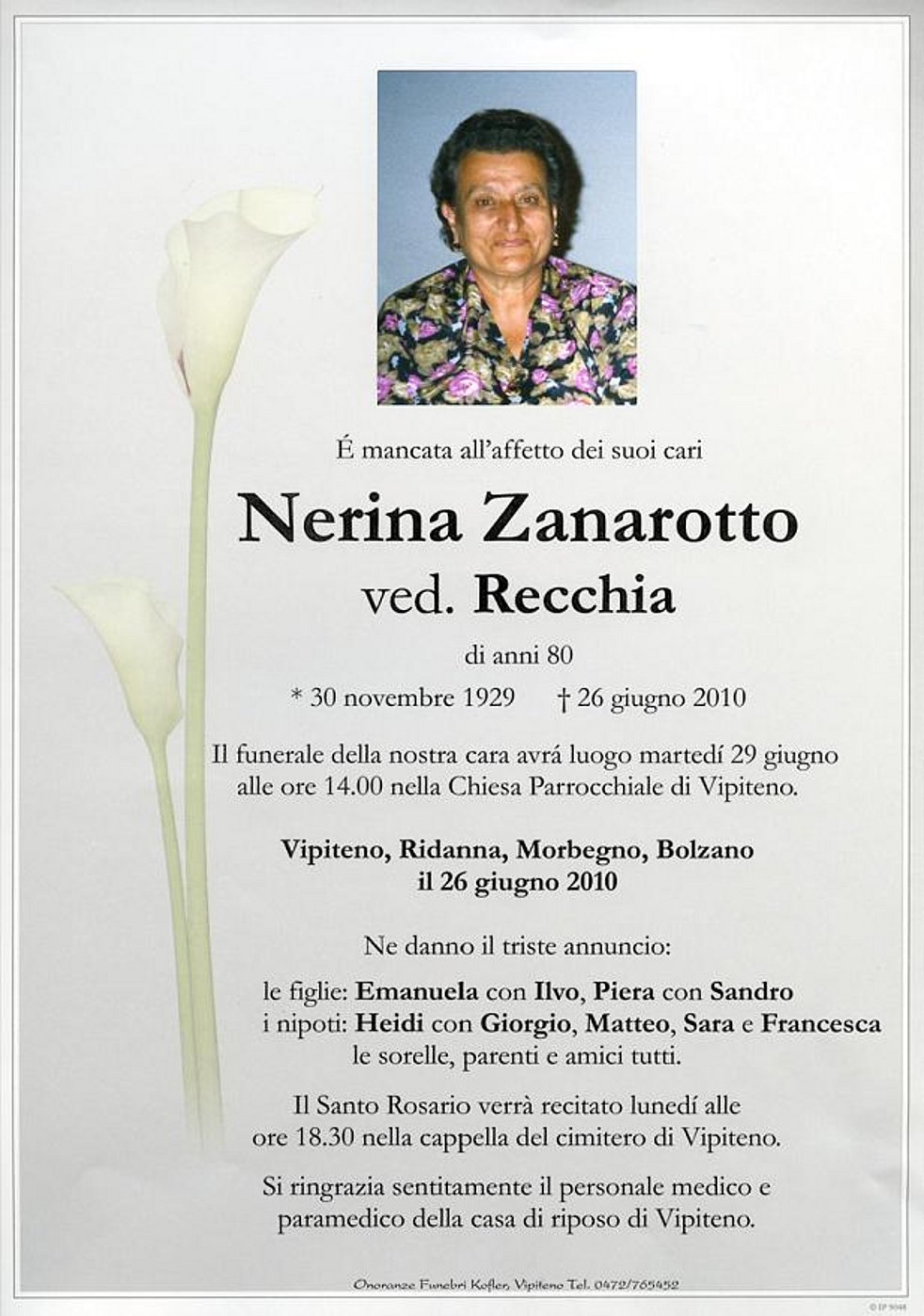 Der Trauergottesdienst findet am Dienstg, 29 Juni, um 14.00 Uhr in der Pfarrkirche von Sterzing statt. Der Seelenrosenkranz wir am Montag um 18.30 Uhr in der Friedhofskapelle von Sterzing gebetet.