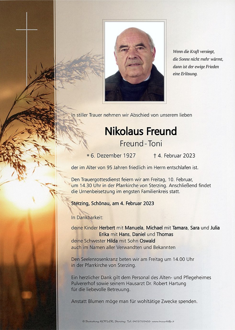 Den Trauergottesdienst feiern wir am Freitag, 10. Februar, um 14.30 Uhr in der Pfarrkirche von Sterzing. Anschließend findet die Urnenbeisetzung im engsten Familienkreis statt.
