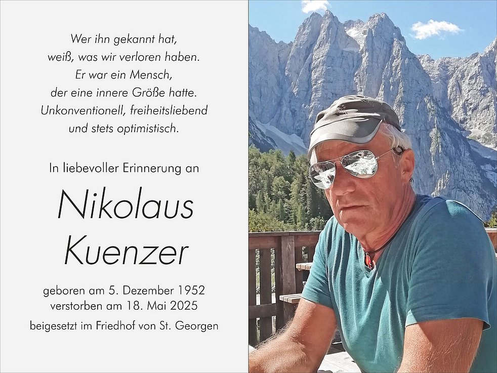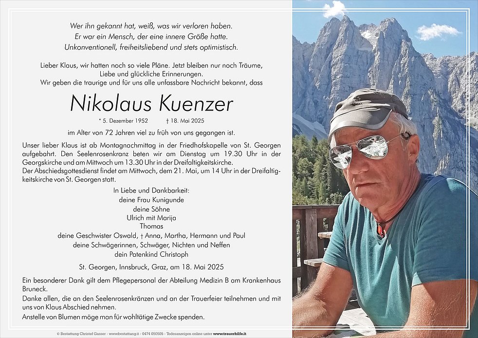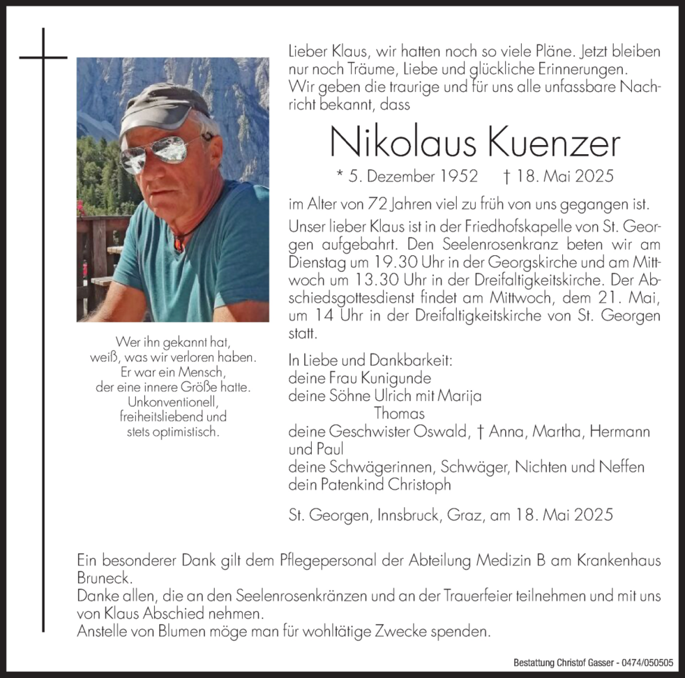 Unser lieber Klaus ist ab Montagnachmittag in der Friedhofskapelle von St. Georgen aufgebahrt.