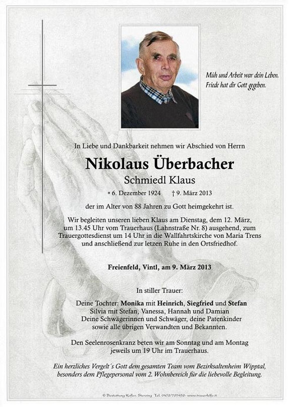 Trauerhaus (Lahnstraße Nr. 8) ausgehend, zum Trauergottesdienst um 14 Uhr in die Wallfahrtskirche von Maria Trens und anschließend zur letzen Ruhe in den Ortsfriedhof.