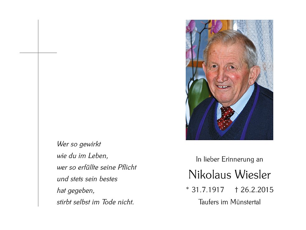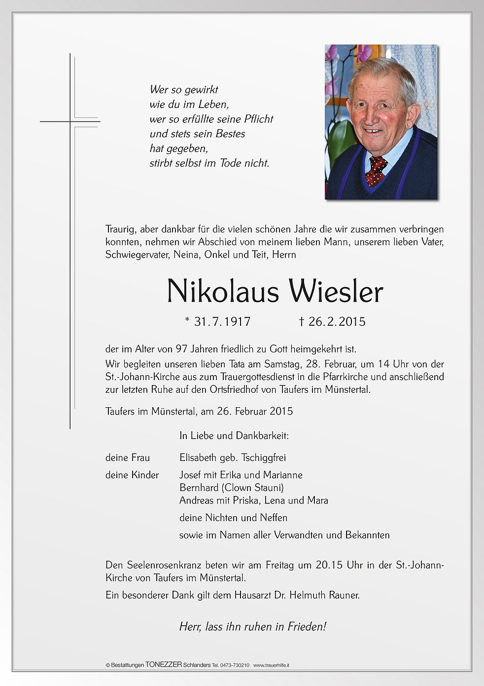 Wir begleiten unseren lieben Tata am Samstag, 28. Februar, um 14 Uhr von der St.-Johann-Kirche aus zum Trauergottesdienst in die Pfarrkirche und anschließend zur letzten Ruhe auf den Ortsfriedhof von Taufers im Münstertal.