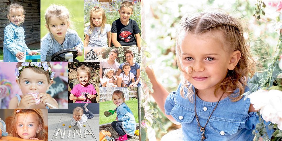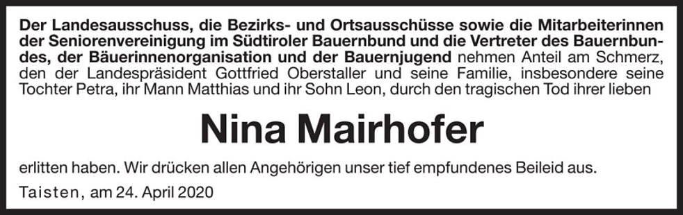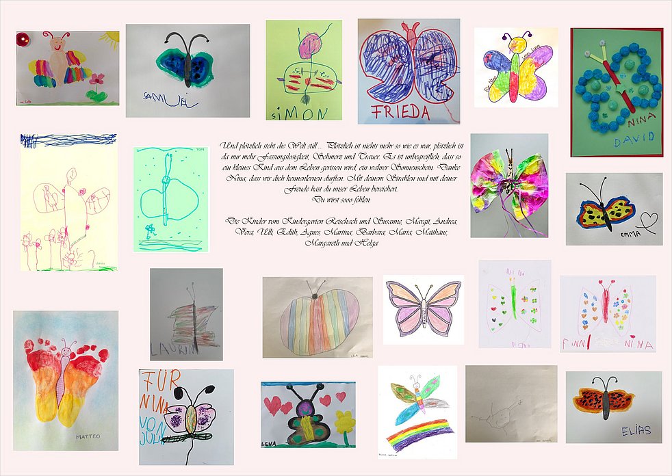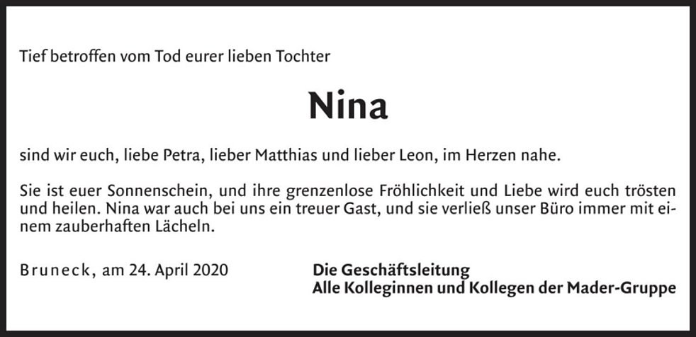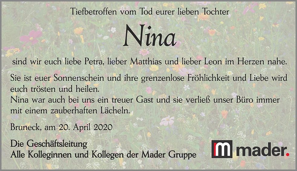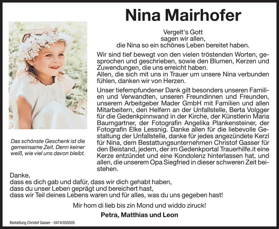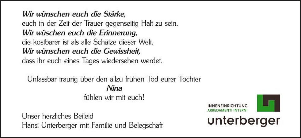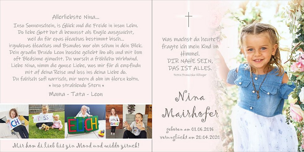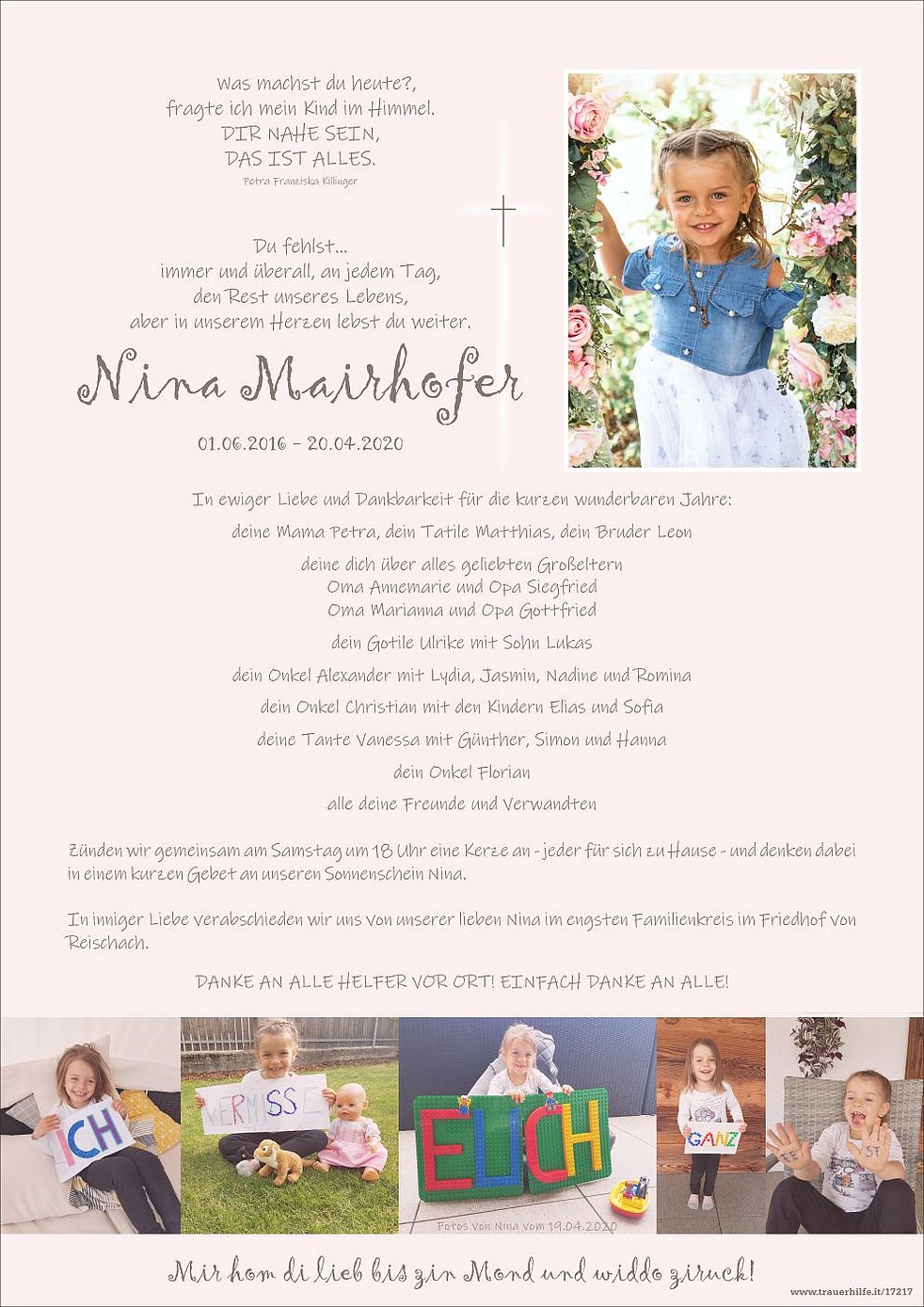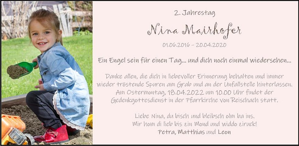 Nina, du wunderschians Engele, oft schaug i dein Bildl on und stell mir vour, wia du mit inserer Sandra in Himml oubm spielsch, learnsch, lochsch und uanfoch lei glücklich bisch. Dr Herrgott hot vir di - sou wie vi dr Sandra und viele ondere junge Leit a - an ondern Plan vourgsechn kop, als mir ins gewünscht hattn. Den Plan wern mir zi Lebzeitn nia verstian kennin. Vielleicht geaht ins amol a Liacht au, wenn mir a de Schwelle überschreiten und mit ench vereint sein. Mochs guat kluans Madile und gib dr Sandra gonz a dicks Bussl vi mir!