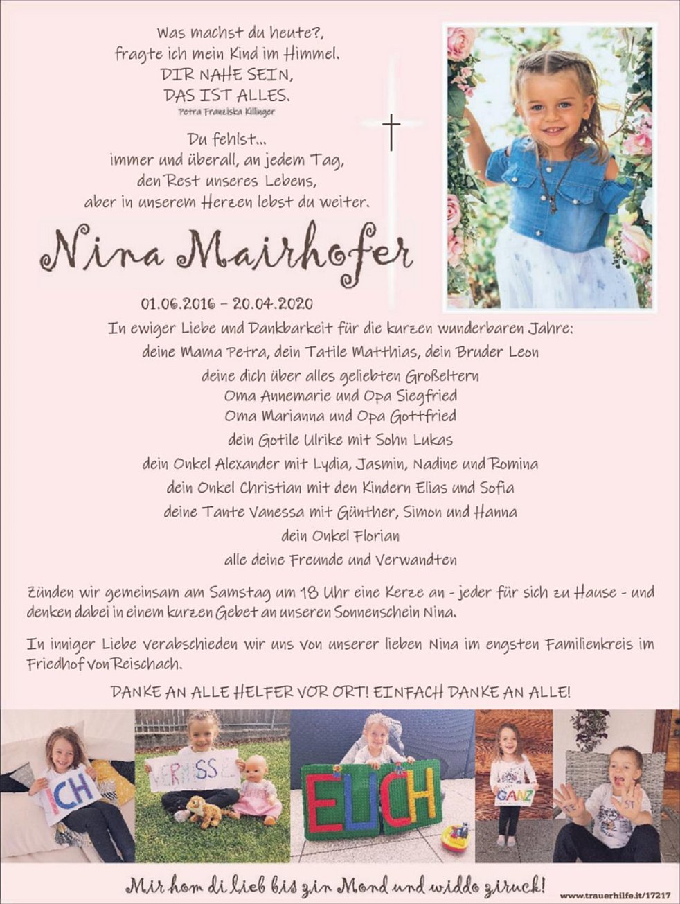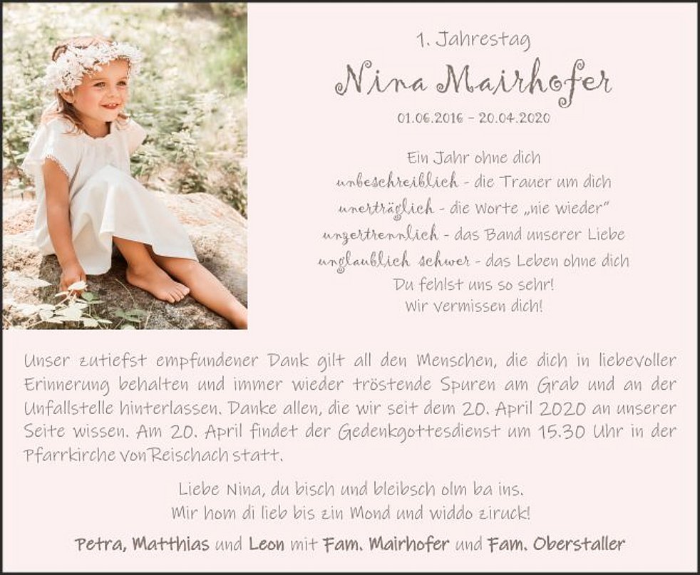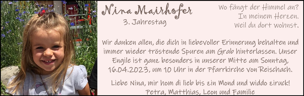 Liebe Nina heint vor 3 Johr hot do liebe Gott di zu ihn koalt für deine Lieben dohoam wor des do schlimmste Albtraum ober i bin mir sicher du bisch weiterhin ba ins und hilfsch ins wenn mir an di denken schmeiß ob und zui a poor Bussis oua noar spürn mir dass du für an kloan Augenblick ba ins bisch. Mir hobm di lieb bis zum Mond und wieder ziruck!! Alles Liebe in den Himmel du kloans Engile!!