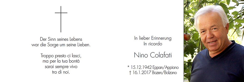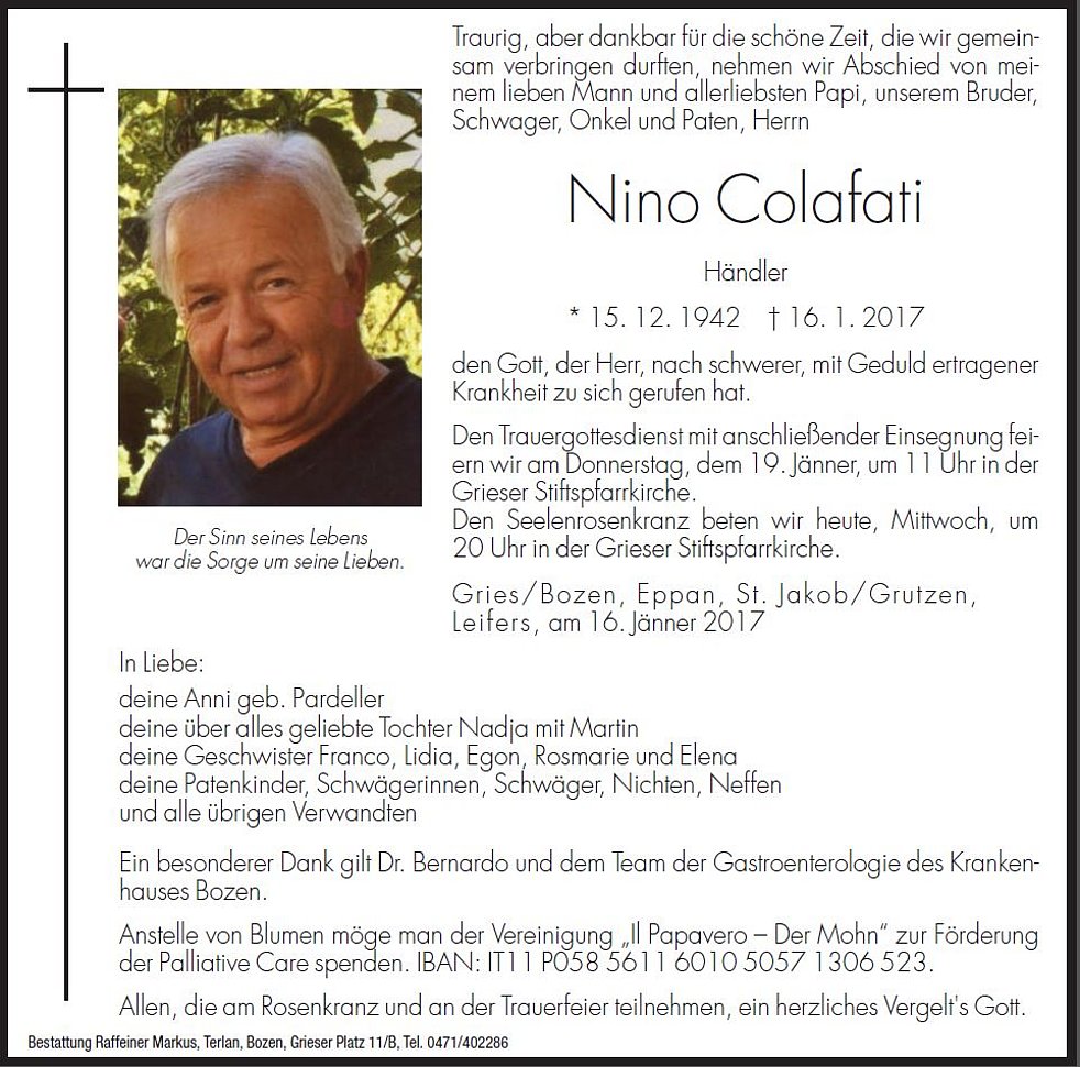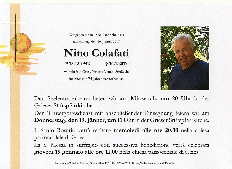Ne danno il triste annuncio la moglie Anni, l`amatissima figlia Nadja con Martin, i fratelli Franco, Lidia, Egon, Rosmarie e Elena, i cognati, i nipoti e parenti tutti.