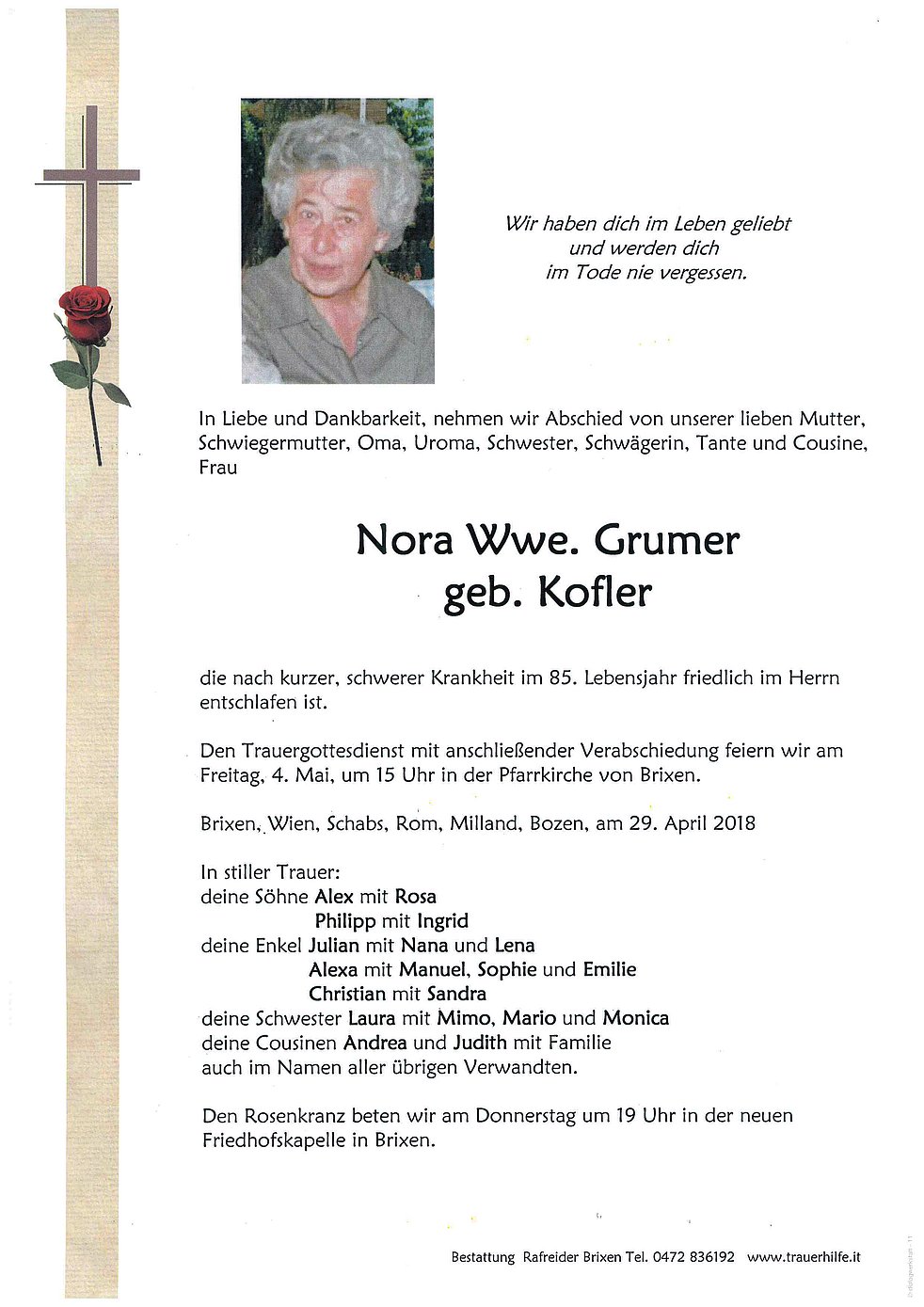 Den Trauergottesdienst mit anschließender Verabschiedung feiern wir am Freitag, 4. Mai, um 15 Uhr in der Pfarrkirche von Brixen.