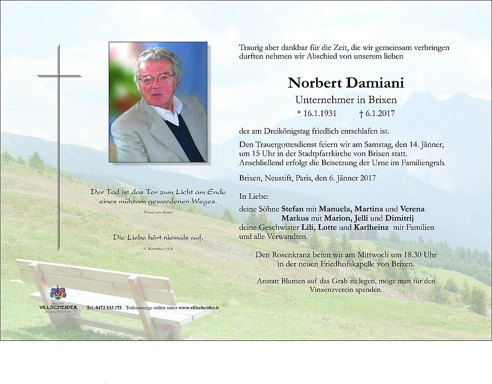 Den Trauergottesdienst feiern wir am Samstag, den 14. Jänner, um 15 Uhr in der Stadtpfarrkirche von Brixen statt.